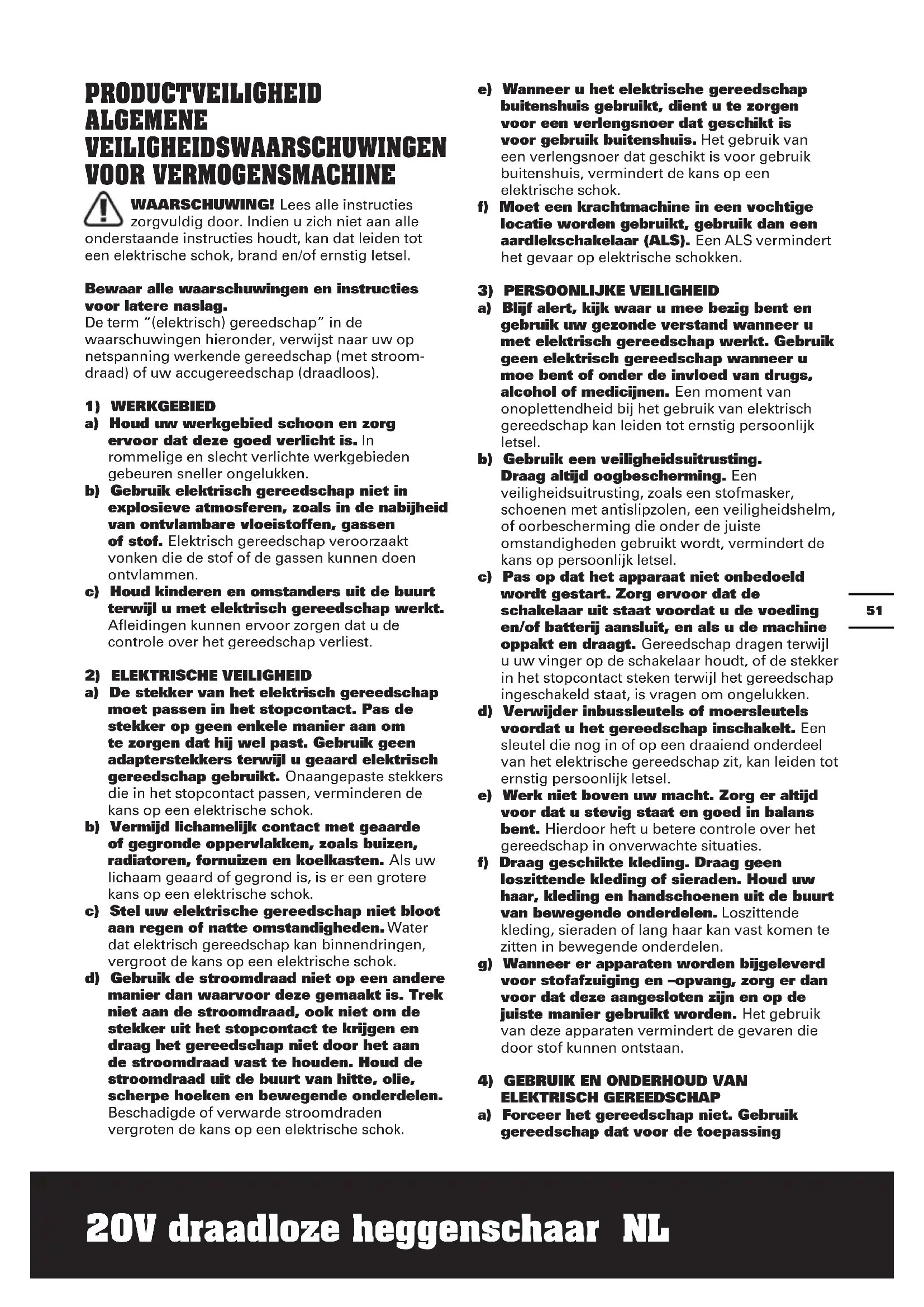 PRODUCTVEILIGHEID ALGEMENE VEILIGHEIDSWAARSCHUWINGEN VOOR VERMOGENSMACHINE WAARSCHUWING! Lees alle instructies zorgvuldig door. Indien u zich niet aan alle onderstaande instructies houdt, kan dat leiden tot een elektrische schok, brand en/of ernstig letsel. Bewaar alle waarschuwingen en instructies voor latere naslag. De term “(elektrisch) gereedschap” in de waarschuwingen hieronder, verwijst naar uw op netspanning werkende gereedschap (met stroom- draad) of uw accugereedschap (draadloos).
