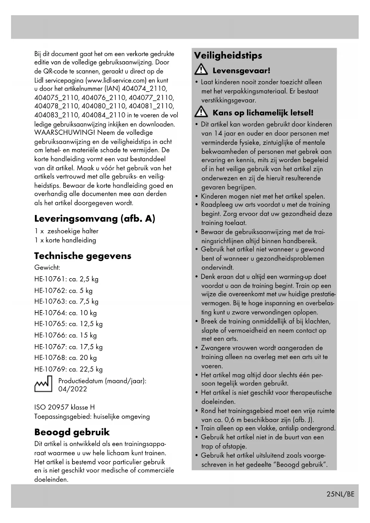 ledige gebruiksaanwijzing inkijken en downloaden. WAARSCHUWING! Neem de volledige gebruiksaanwijzing en de veiligheidstips in acht om letsel- en materiële schade te vermijden. De korte handleiding vormt een vast bestanddeel van dit artikel. Maak u vóór het gebruik van het artikels vertrouwd met alle gebruiks- en veilig- heidstips. Bewaar de korte handleiding goed en overhandig alle documenten mee aan derden als het artikel doorgegeven wordt. Leveringsomvang (afb. A) 1 x zeshoekige halter 1 x korte handleiding Technische gegevens Gewicht: HE-10761: ca. 2,5 kg HE-10762: ca. 5 kg HE-10763: ca. 7,5 kg HE-10764: ca. 10 kg HE-10765: ca. 12,5 kg HE-10766: ca. 15 kg HE-10767: ca. 17,5 kg HE-10768: ca. 20 kg HE-10769: ca. 22,5 kg Productiedatum (maand/jaar): 04/2022 ISO 20957 klasse H Toepassingsgebied: huiselijke omgeving Beoogd gebruik Dit artikel is ontwikkeld als een trainingsappa- raat waarmee u uw hele lichaam kunt trainen. Het artikel is bestemd voor particulier gebruik en is niet geschikt voor medische of commerciële doeleinden. Veiligheidstips Levensgevaar!