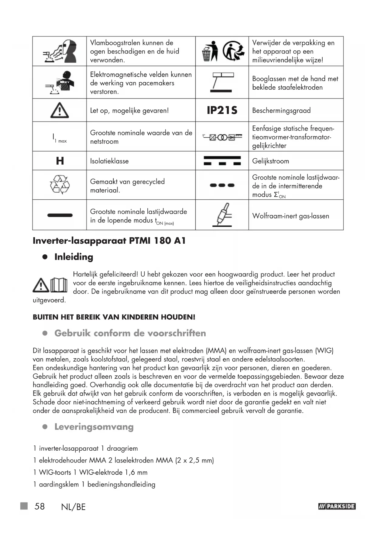 Grootste nominale lastijdwaarde in de lopende modus t ON (max) Wolfraam-inert gas-lassen Inverter-lasapparaat PTMI 180 A1 z Inleiding Hartelijk gefeliciteerd! U hebt gekozen voor een hoogwaardig product. Leer het product voor de eerste ingebruikname kennen. Lees hiertoe de veiligheidsinstructies aandachtig door. De ingebruikname van dit product mag alleen door geïnstrueerde personen worden uitgevoerd. BUITEN HET BEREIK VAN KINDEREN HOUDEN! z Gebruik conform de voorschriften Dit lasapparaat is geschikt voor het lassen met elektroden (MMA) en wolfraam-inert gas-lassen (WIG) van metalen, zoals koolstofstaal, gelegeerd staal, roestvrij staal en andere edelstaalsoorten. Een ondeskundige hantering van het product kan gevaarlijk zijn voor personen, dieren en goederen. Gebruik het product alleen zoals is beschreven en voor de vermelde toepassingsgebieden. Bewaar deze handleiding goed. Overhandig ook alle documentatie bij de overdracht van het product aan derden. Elk gebruik dat afwijkt van het gebruik conform de voorschriften, is verboden en is mogelijk gevaarlijk. Schade door niet-inachtneming of verkeerd gebruik wordt niet door de garantie gedekt en valt niet onder de aansprakelijkheid van de producent. Bij commercieel gebruik vervalt de garantie. z Leveringsomvang 1 inverter-lasapparaat 1 draagriem 1 elektrodehouder MMA 2 laselektroden MMA (2 x 2,5mm) 1 WIG-toorts 1 WIG-elektrode 1,6mm 1 aardingsklem 1 bedieningshandleidingNL/BE