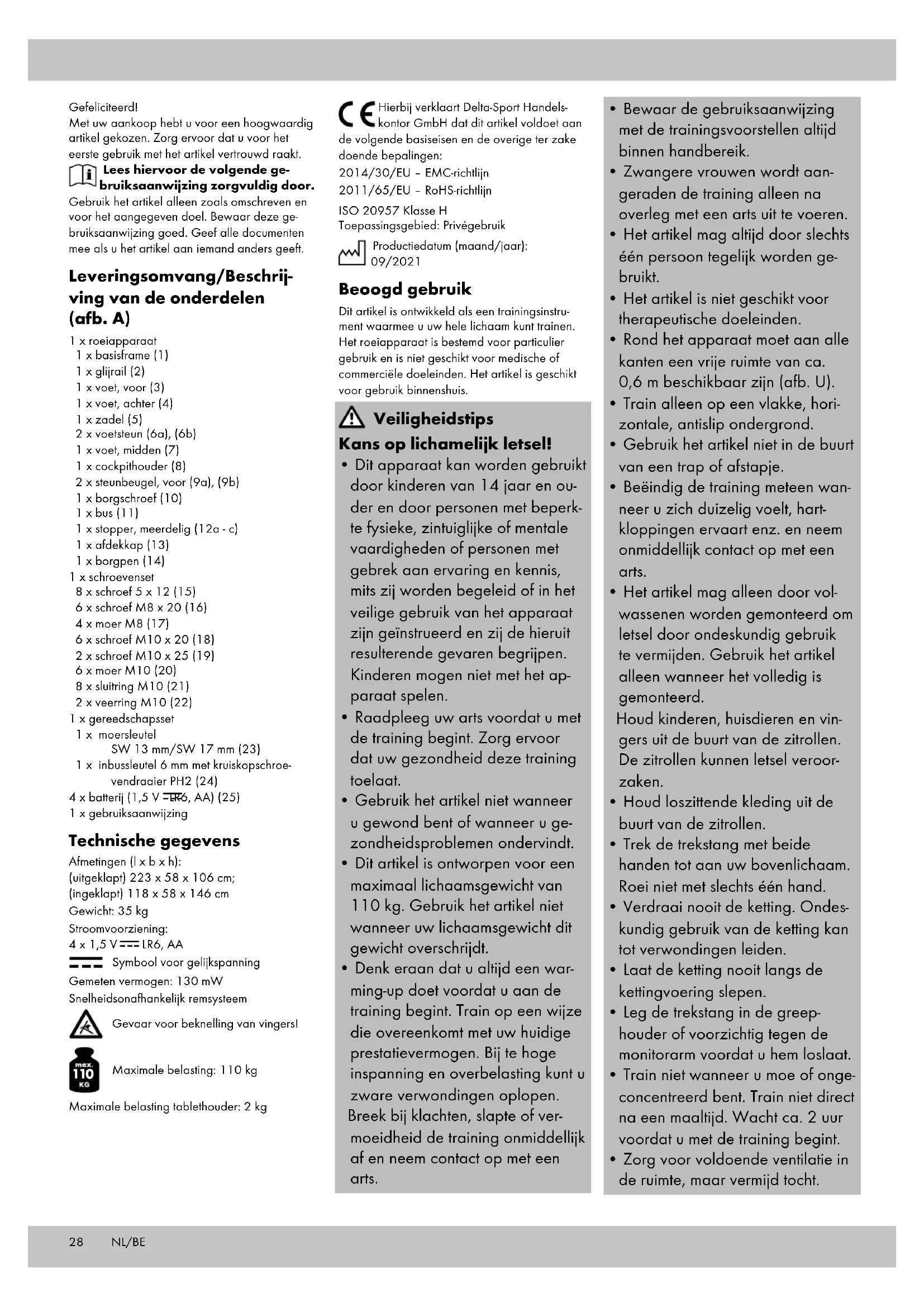 Maximale belasting: 110 kg Maximale belasting tablethouder: 2 kg Hierbij verklaart Delta-Sport Handels- kontor GmbH dat dit artikel voldoet aan de volgende basiseisen en de overige ter zake doende bepalingen: 2014/30/EU – EMC-richtlijn 2011/65/EU – RoHS-richtlijn ISO 20957 Klasse H Toepassingsgebied: Privégebruik Productiedatum (maand/jaar): 09/2021 Beoogd gebruik Dit artikel is ontwikkeld als een trainingsinstru- ment waarmee u uw hele lichaam kunt trainen. Het roeiapparaat is bestemd voor particulier gebruik en is niet geschikt voor medische of commerciële doeleinden. Het artikel is geschikt voor gebruik binnenshuis. Veiligheidstips Kans op lichamelijk letsel!