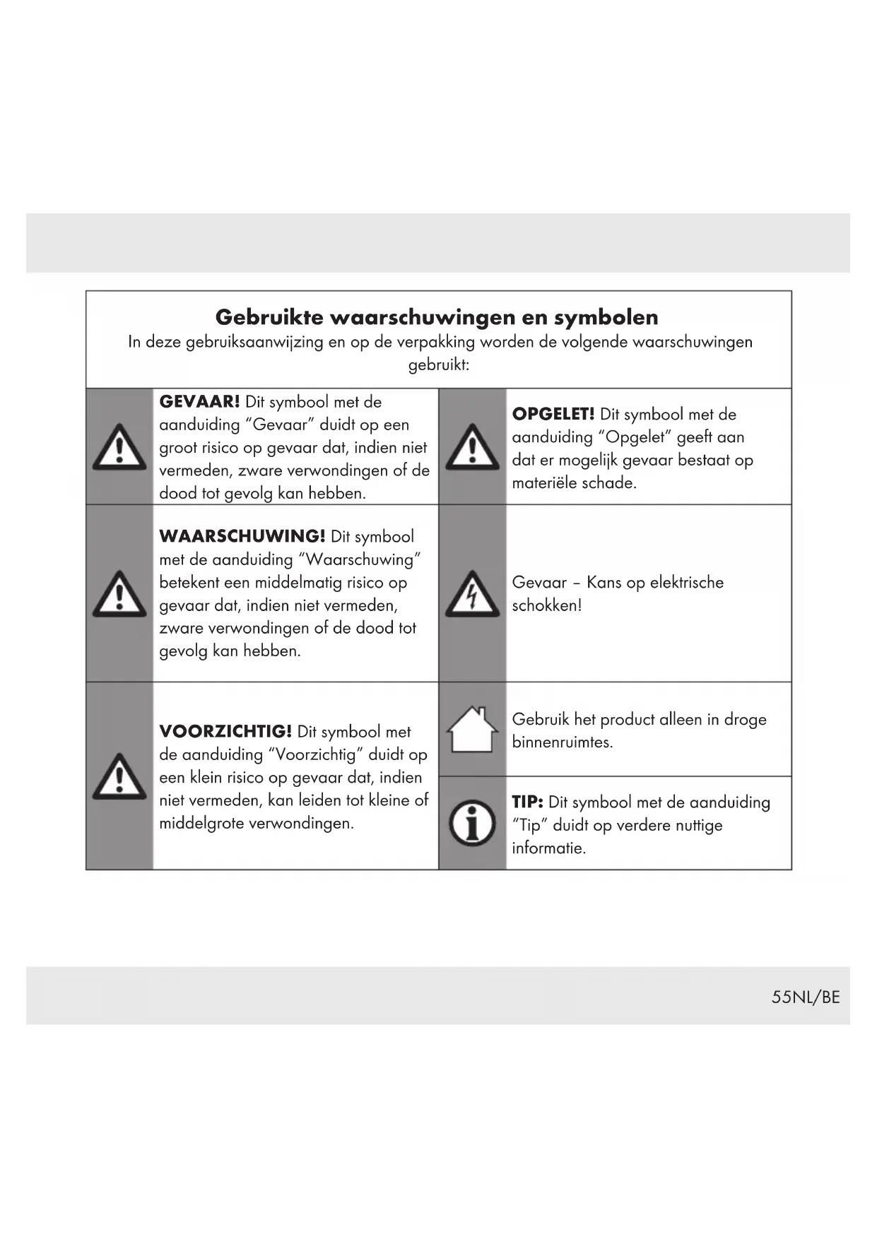 KINDEREN! Laat kinderen nooit zonder toezicht achter met het verpakkingsmateriaal. Het verpakkingsmateriaal vormt een verstikkingsgevaar. Kinderen onderschatten vaak de daaraan verbonden gevaren. Houd kinderen altijd uit de buurt van verpakkingsmateriaal. Dit product mag door kinderen vanaf 8jaar alsmede door personen met verminderde fysieke, sensorische of geestelijke vermogens of gebrek aan ervaring en kennis alleen gebruikt worden als ze onder supervisie staan of geïnstrueerd zijn wat betreft veilig gebruik van het product en begrepen hebben welke gevaren uit dat gebruik voortvloeien. Schoonmaken en onderhoud door de gebruiker mogen niet door kinderen worden verricht tenzij zij 8jaar of ouder zijn en onder toezicht staan.60 NL/BE Kinderen mogen niet met het product spelen. Houd het product en het aansluitsnoer buiten bereik van kinderen jonger dan 8jaar. Beoogd gebruik