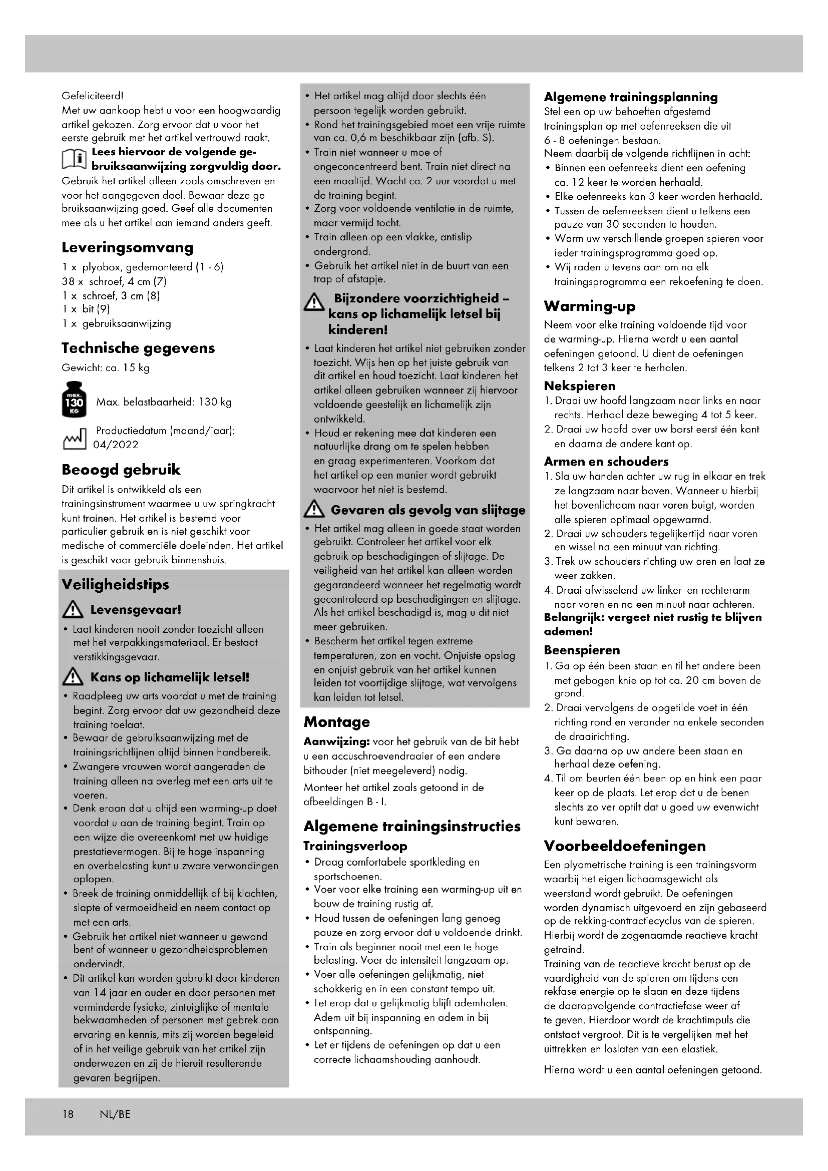 Max. belastbaarheid: 130 kg Productiedatum (maand/jaar): 04/2022 Beoogd gebruik Dit artikel is ontwikkeld als een trainingsinstrument waarmee u uw springkracht kunt trainen. Het artikel is bestemd voor particulier gebruik en is niet geschikt voor medische of commerciële doeleinden. Het artikel is geschikt voor gebruik binnenshuis. Veiligheidstips Levensgevaar!