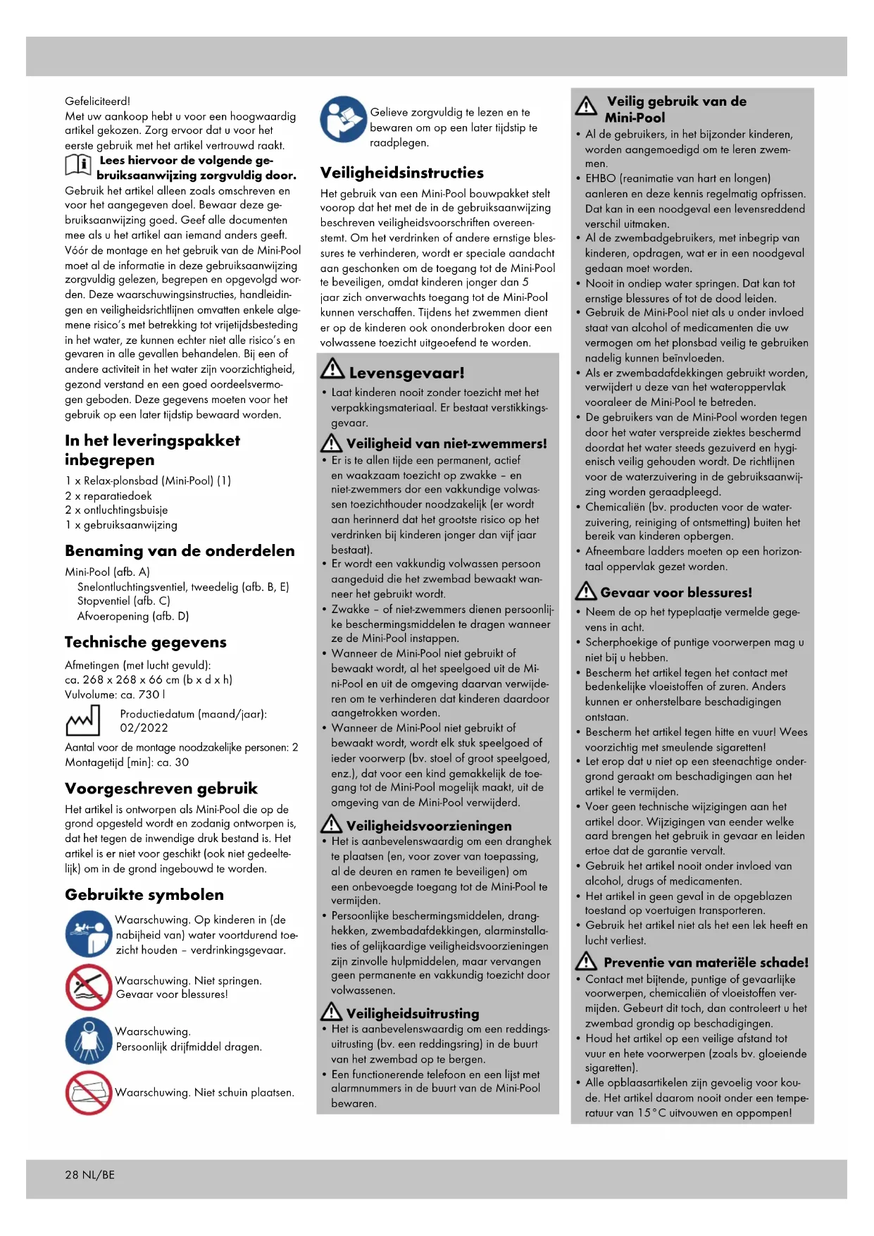 - Wanneer de Mini-Pool niet gebruikt of bewaakt wordt, wordt elk stuk speelgoed of ieder voorwerp (bv. stoel of groot speelgoed, enz.), dat voor een kind gemakkelijk de toe- gang tot de Mini-Pool mogelijk maakt, uit de omgeving van de Mini-Pool verwijderd. Veiligheidsvoorzieningen