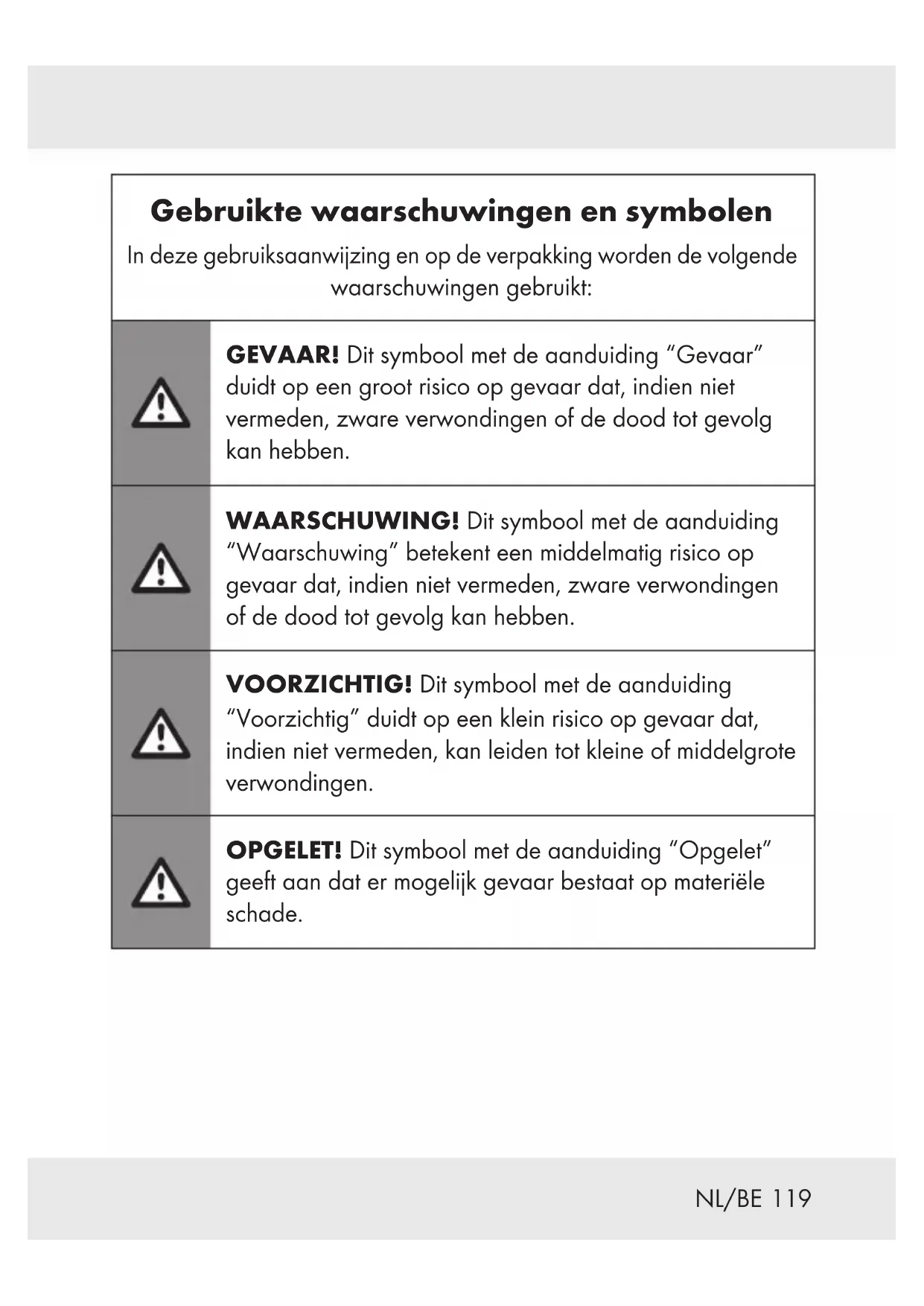 Toerental per minuut Het CE-teken bevestigt dat het product voldoet aan de betreffende EU-richtlijnen.122 NL/BE ACCU-SCHROEVENDRAAIER4V Inleiding Hartelijk gefeliciteerd met de aankoop van uw nieuwe product. U heeft voor een hoogwaardig product gekozen. De gebruiksaanwijzing is een deel van het product. Deze bevat belangrijke aanwijzingen voor veiligheid, gebruik en verwijdering. Maakt U zich voor de ingebruikname van het product met alle bedienings- en veiligheidsvoorschriften vertrouwd. Gebruik het product alleen zoals beschreven en voor de aangegeven toepassingsgebieden. Overhandig alle documenten bij doorgifte van het product aan derden. Beoogd gebruik Deze accu-schroevendraaier4V (hierna “product” of “elektrisch apparaat” genoemd) is bedoeld voor het vastdraaien en losdraaien van schroeven. Gebruik het inzetgereedschap (opzetstukken en bitjes) altijd zoals beoogd! Neem bij de aanschaf en het gebruik van insteekgereedschap de technische eisen van het product in acht (zie “Technische gegevens”). De LED-werklamp [] van dit product is bestemd voor directe verlichting van de werkplek.123 NL/BE Ander gebruik van of wijzigingen aan het product worden beschouwd als onjuist en kunnen risico's zoals levensgevaar, letsel en beschadigingen met zich meebrengen. De fabrikant wijst iedere aansprakelijkheid af voor schade die is ontstaan door ander gebruik dan het beoogde. Het product is niet voor commercieel gebruik of voor vergelijkbare toepassingen bestemd. Levering