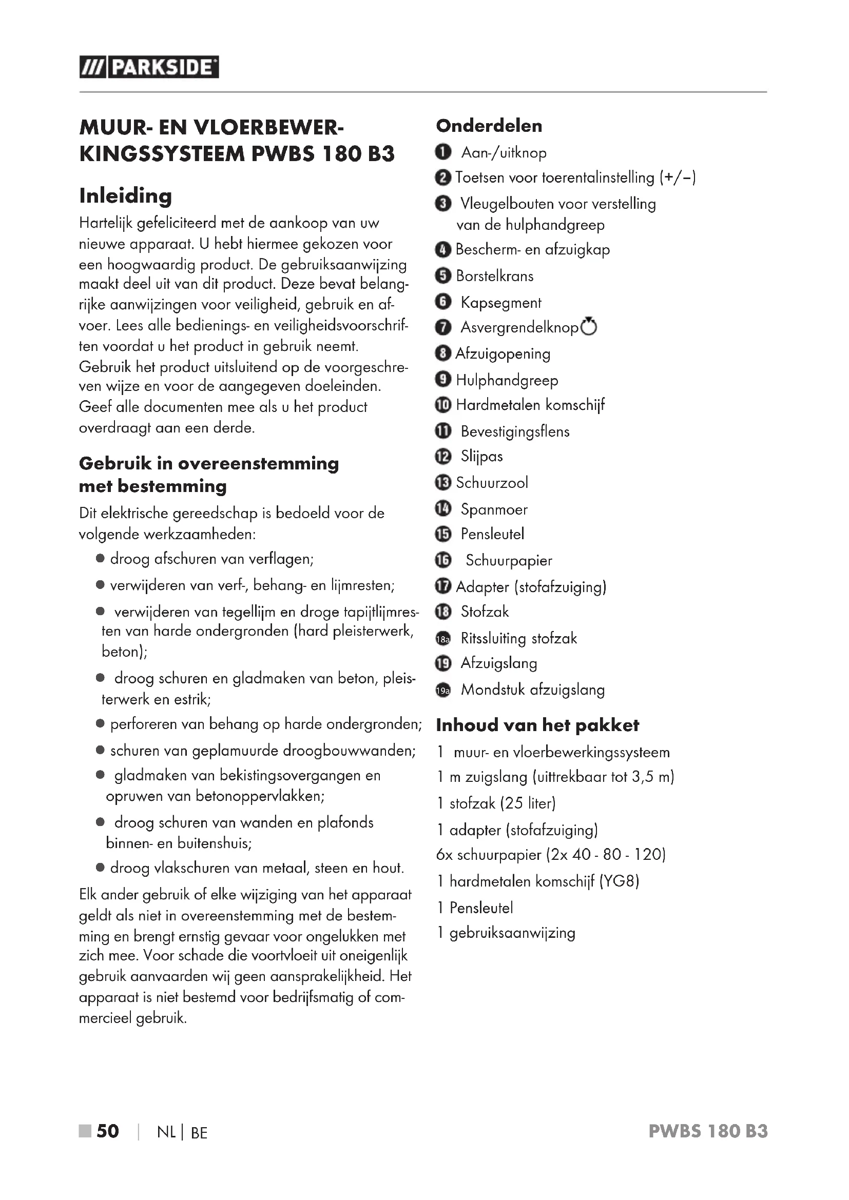 Inleiding Hartelijk gefeliciteerd met de aankoop van uw nieuwe apparaat. U hebt hiermee gekozen voor een hoogwaardig product. De gebruiksaanwijzing maakt deel uit van dit product. Deze bevat belang- rijke aanwijzingen voor veiligheid, gebruik en af- voer. Lees alle bedienings- en veiligheidsvoorschrif- ten voordat u het product in gebruik neemt. Gebruik het product uitsluitend op de voorgeschre- ven wijze en voor de aangegeven doeleinden. Geef alle documenten mee als u het product overdraagt aan een derde. Gebruik in overeenstemming met bestemming Dit elektrische gereedschap is bedoeld voor de volgende werkzaamheden: ▯ droog afschuren van verflagen; ▯ verwijderen van verf-, behang- en lijmresten; ▯ verwijderen van tegellijm en droge tapijtlijmres- ten van harde ondergronden (hard pleisterwerk, beton); ▯ droog schuren en gladmaken van beton, pleis- terwerk en estrik; ▯ perforeren van behang op harde ondergronden; ▯ schuren van geplamuurde droogbouwwanden; ▯ gladmaken van bekistingsovergangen en opruwen van betonoppervlakken; ▯ droog schuren van wanden en plafonds binnen- en buitenshuis; ▯ droog vlakschuren van metaal, steen en hout. Elk ander gebruik of elke wijziging van het apparaat geldt als niet in overeenstemming met de bestem- ming en brengt ernstig gevaar voor ongelukken met zich mee. Voor schade die voortvloeit uit oneigenlijk gebruik aanvaarden wij geen aansprakelijkheid. Het apparaat is niet bestemd voor bedrijfsmatig of com- mercieel gebruik. Onderdelen Aan-/uitknop Toetsen voor toerentalinstelling (+/–) Vleugelbouten voor verstelling van de hulphandgreep Bescherm- en afzuigkap Borstelkrans Kapsegment Asvergrendelknop Afzuigopening Hulphandgreep Hardmetalen komschijf Bevestigingsflens Slijpas Schuurzool Spanmoer Pensleutel Schuurpapier Adapter (stofafzuiging) Stofzak 18a Ritssluiting stofzak Afzuigslang 19a Mondstuk afzuigslang Inhoud van het pakket 1 muur- en vloerbewerkingssysteem 1 m zuigslang (uittrekbaar tot 3,5 m) 1 stofzak (25 liter) 1 adapter (stofafzuiging) 6x schuurpapier (2x 40 - 80 - 120) 1 hardmetalen komschijf (YG8) 1 Pensleutel 1 gebruiksaanwijzingPWBS 180 B3