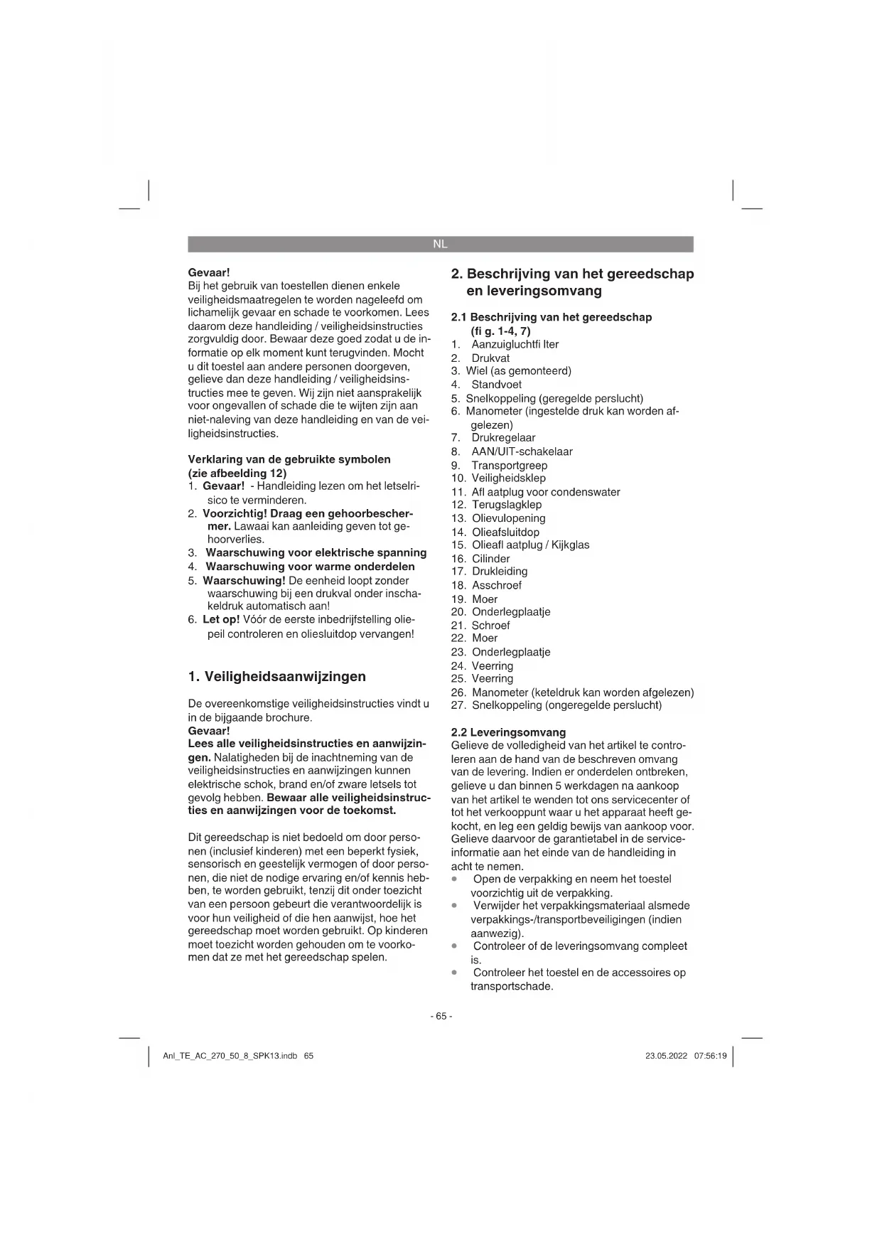 Gebruik flexibele slangen om een overbren- ging van ontoelaatbare lasten op het buislei- dingsysteem aan de verbinding van de com- pressorinstallatie naar het buisleidingsysteem te vermijden. Anl_TE_AC_270_50_8_SPK13.indb 66Anl_TE_AC_270_50_8_SPK13.indb 66 23.05.2022 07:56:2023.05.2022 07:56:20NL