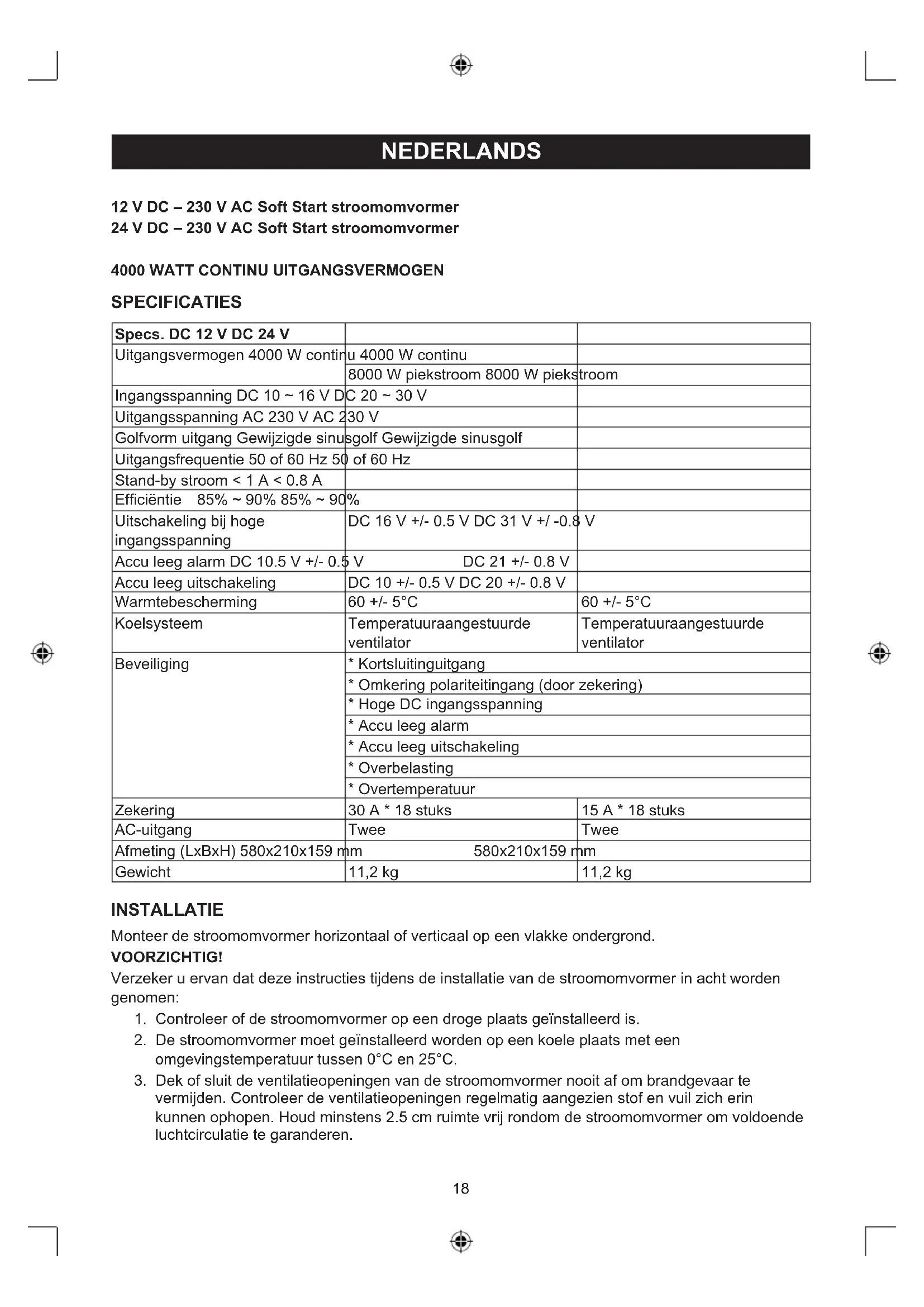 SPECIFICATIES Specs. DC 12 V DC 24 V Uitgangsvermogen 4000 W continu 4000 W continu 8000 W piekstroom 8000 W piekstroom Ingangsspanning DC 10 ~ 16 V DC 20 ~ 30 V Uitgangsspanning AC 230 V AC 230 V Golfvorm uitgang Gewijzigde sinusgolf Gewijzigde sinusgolf Uitgangsfrequentie 50 of 60 Hz 50 of 60 Hz Stand-by stroom < 1 A < 0.8 A Efciëntie 85% ~ 90% 85% ~ 90% Uitschakeling bij hoge ingangsspanning DC 16 V +/- 0.5 V DC 31 V +/ -0.8 V Accu leeg alarm DC 10.5 V +/- 0.5 V DC 21 +/- 0.8 V Accu leeg uitschakeling DC 10 +/- 0.5 V DC 20 +/- 0.8 V Warmtebescherming 60 +/- 5°C 60 +/- 5°C Koelsysteem Temperatuuraangestuurde ventilator Temperatuuraangestuurde ventilator Beveiliging * Kortsluitinguitgang