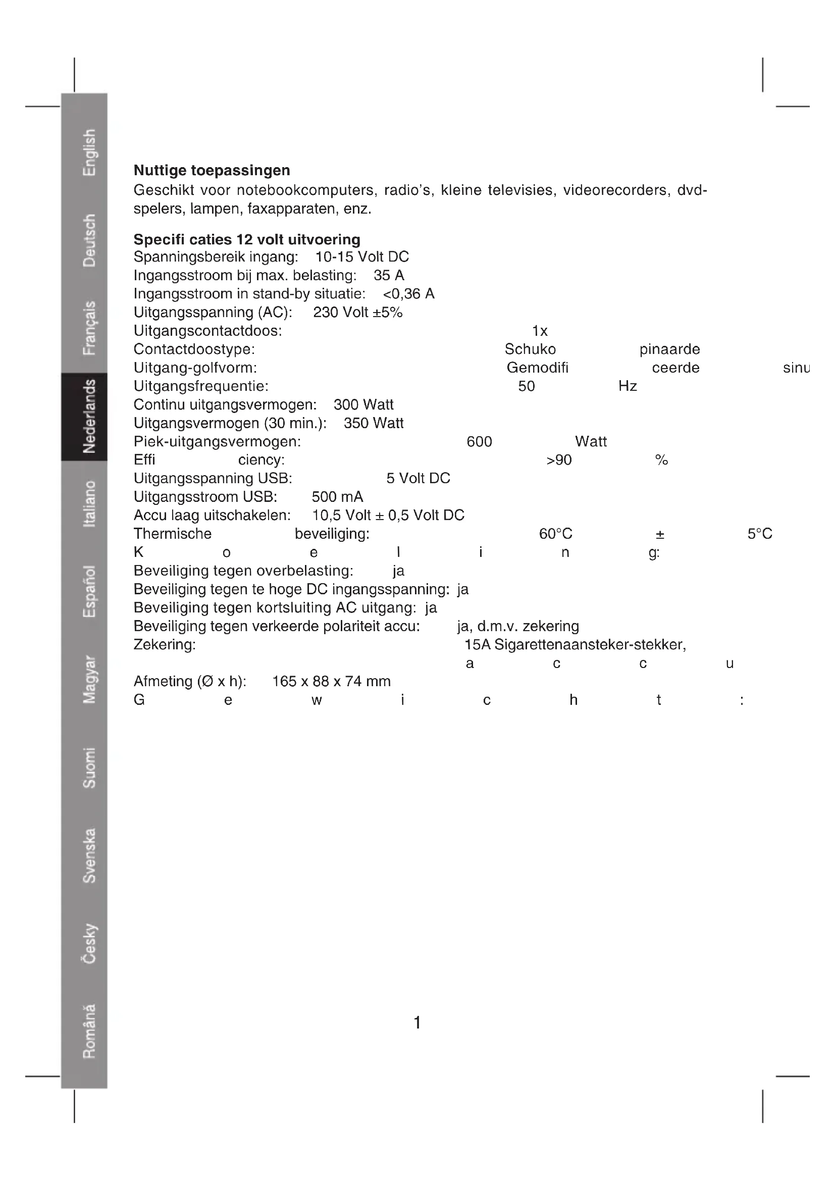 Zorg ervoor dat het maximum afgenomen vermogen van de aangesloten apparatuur Niet hoger is dan het uitgangsvermogen van deze inverter (300 Watt continu, 350 Watt gedurende max. 30 minutes)