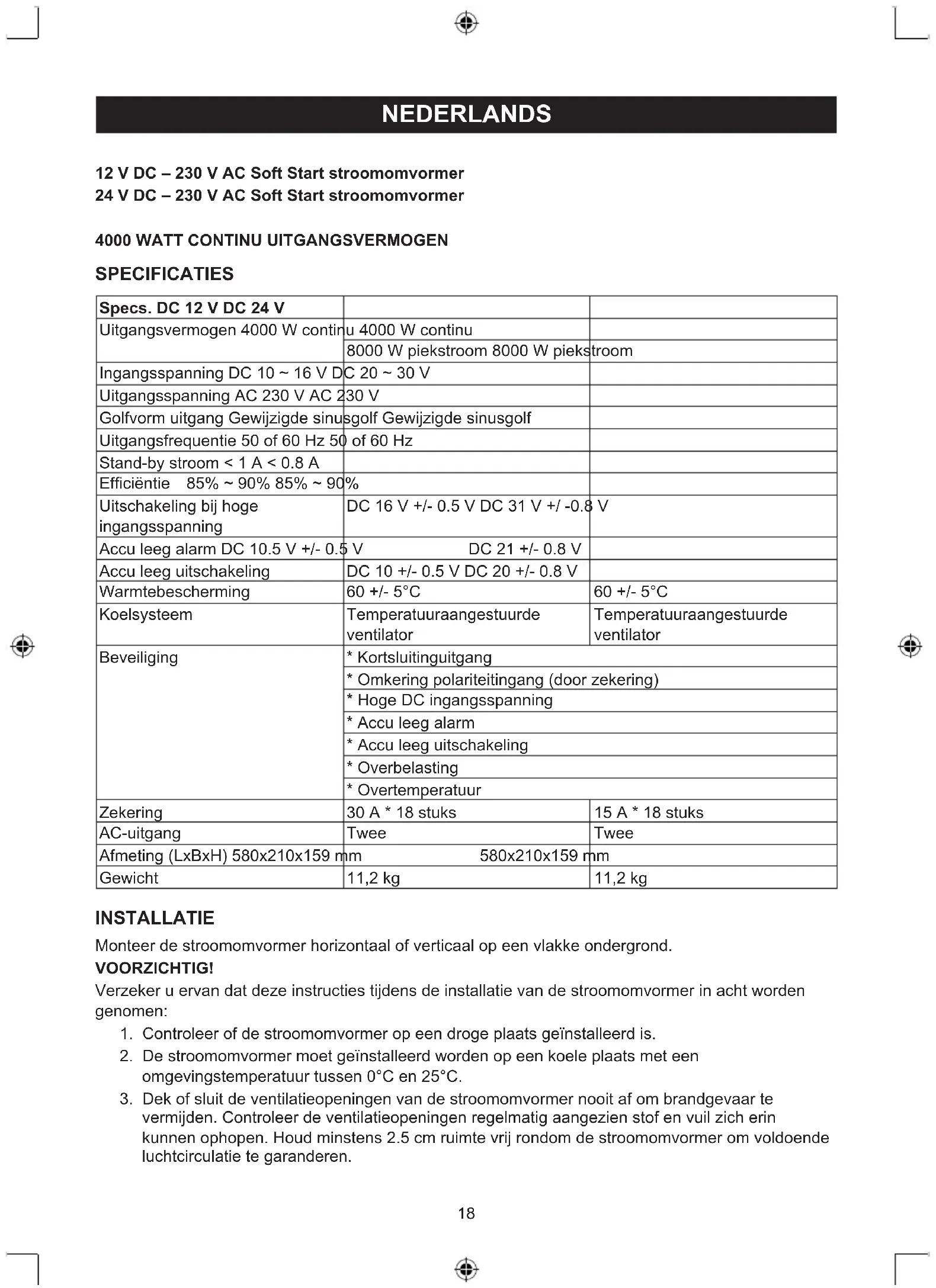 SPECIFICATIES Specs. DC 12 V DC 24 V Uitgangsvermogen 4000 W continu 4000 W continu 8000 W piekstroom 8000 W piekstroom Ingangsspanning DC 10 ~ 16 V DC 20 ~ 30 V Uitgangsspanning AC 230 V AC 230 V Golfvorm uitgang Gewijzigde sinusgolf Gewijzigde sinusgolf Uitgangsfrequentie 50 of 60 Hz 50 of 60 Hz Stand-by stroom < 1 A < 0.8 A Efciëntie 85% ~ 90% 85% ~ 90% Uitschakeling bij hoge ingangsspanning DC 16 V +/- 0.5 V DC 31 V +/ -0.8 V Accu leeg alarm DC 10.5 V +/- 0.5 V DC 21 +/- 0.8 V Accu leeg uitschakeling DC 10 +/- 0.5 V DC 20 +/- 0.8 V Warmtebescherming 60 +/- 5°C 60 +/- 5°C Koelsysteem Temperatuuraangestuurde ventilator Temperatuuraangestuurde ventilator Beveiliging * Kortsluitinguitgang