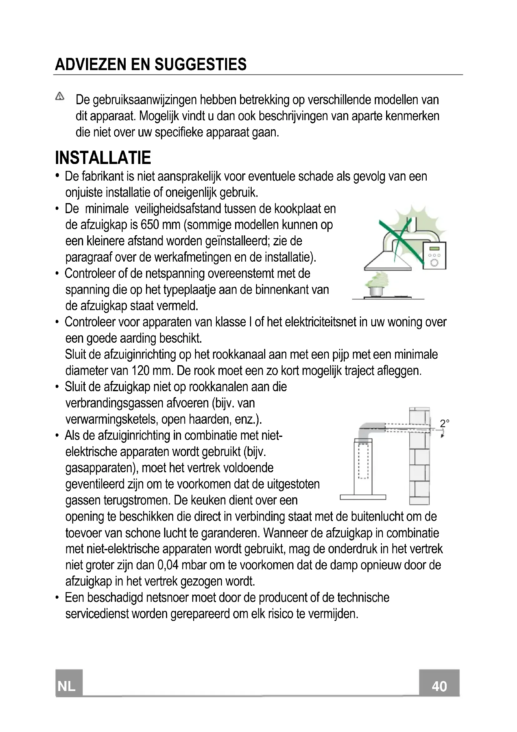 - Als de afzuiginrichting in combinatie met niet- elektrische apparaten wordt gebruikt (bijv. gasapparaten), moet het vertrek voldoende geventileerd zijn om te voorkomen dat de uitgestoten gassen terugstromen. De keuken dient over een opening te beschikken die direct in verbinding staat met de buitenlucht om de toevoer van schone lucht te garanderen. Wanneer de afzuigkap in combinatie met niet-elektrische apparaten wordt gebruikt, mag de onderdruk in het vertrek niet groter zijn dan 0,04 mbar om te voorkomen dat de damp opnieuw door de afzuigkap in het vertrek gezogen wordt.