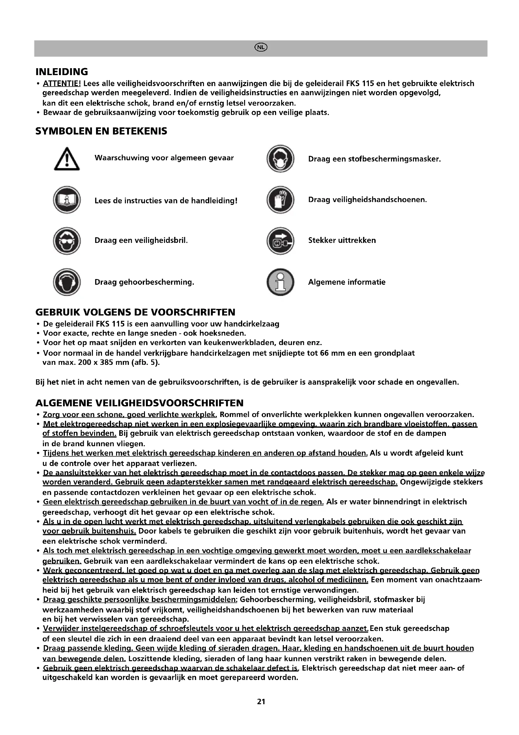 - ATTENTIE! Lees alle veiligheidsvoorschriften en aanwijzingen die bij de geleiderail FKS 115 en het gebruikte elektrisch gereedschap werden meegeleverd. Indien de veiligheidsinstructies en aanwijzingen niet worden opgevolgd, kan dit een elektrische schok, brand en/of ernstig letsel veroorzaken.