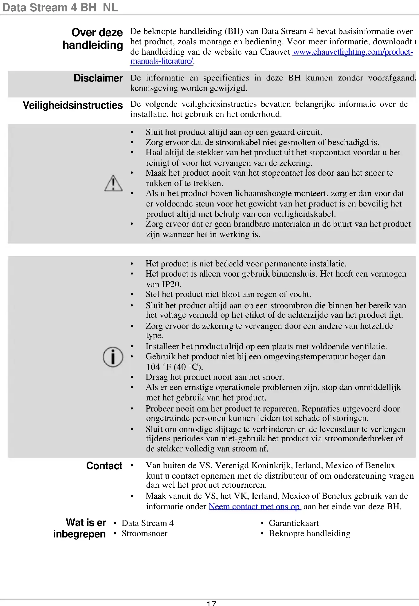 De beknopte handleiding (BH) van Data Stream 4 bevat basisinformatie over het product, zoals montage en bediening. Voor meer informatie, downloadt u de handleiding van de website van Chauvet www.chauvetlighting.com/product- manuals-literature/. Disclaimer De informatie en specificaties in deze BH kunnen zonder voorafgaande kennisgeving worden gewijzigd. Veiligheidsinstructies De volgende veiligheidsinstructies bevatten belangrijke informatie over de installatie, het gebruik en het onderhoud.