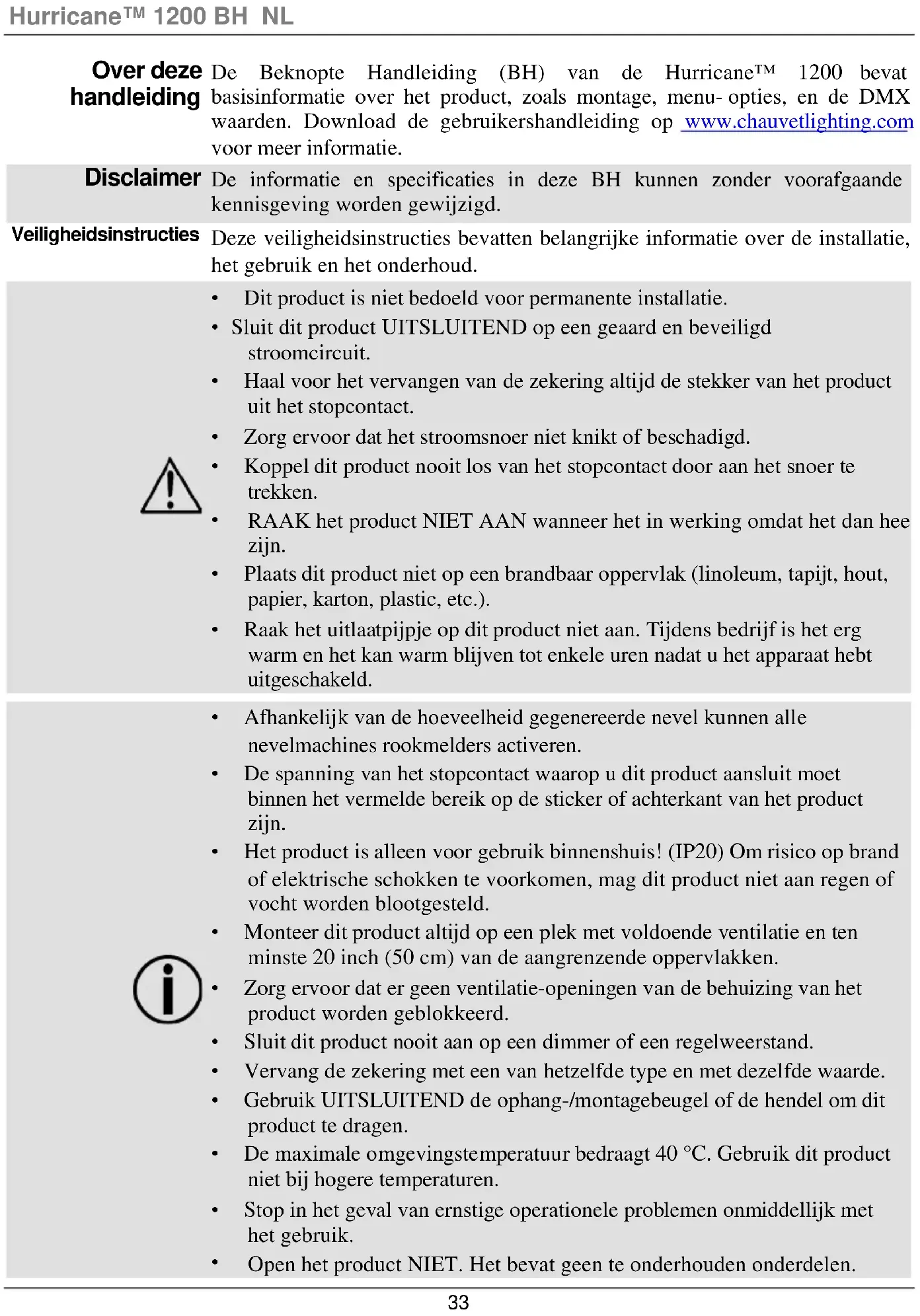 De Beknopte Handleiding (BH) van de Hurricane™ 1200 bevat basisinformatie over het product, zoals montage, menu- opties, en de DMX waarden. Download de gebruikershandleiding op www.chauvetlighting.com