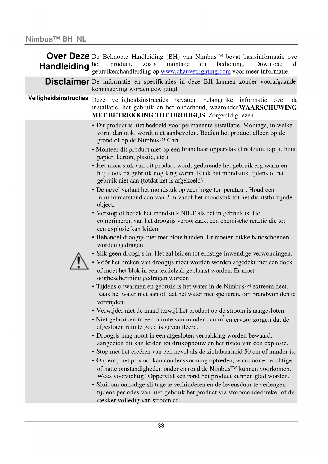 Over Deze Handleiding De Beknopte H andleiding (BH) van Nimbus™ bevat basisinformatie over het product, zoals montage en bediening. Download de gebruikershandleiding op www.chauvetlighting.com voor meer informatie. Disclaimer De informatie en specificaties in deze BH kunnen zonder voorafgaande kennisgeving worden gewijzigd. Veiligheidsinstructies Deze veiligheidsinstructies bevatten belangrijke informatie over de installatie, het gebruik en het onderhoud, waaronder WAARSCHUWING MET BETREKKING TOT DROOGIJS. Zorgvuldig lezen!