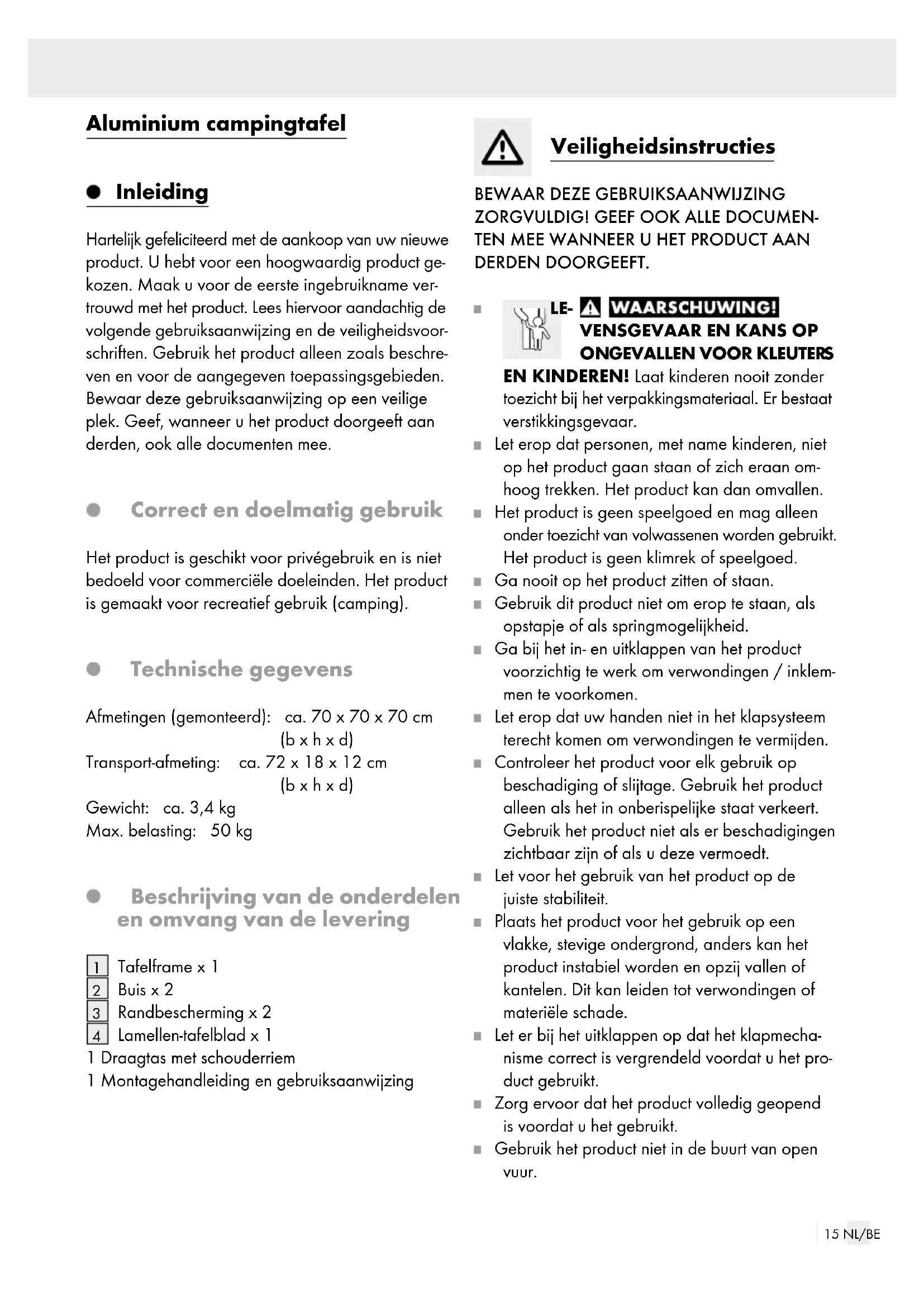 caisse) et d’une description écrite du défaut avec mention de sa date d’apparition. Service après-vente Service après-vente France Tél. : 0800904879 E-Mail : owim@lidl.fr Service après-vente Belgique Tél. : 080071011 Tél. : 80023970 (Luxembourg) E-Mail : owim@lidl.be15 NL/BE Aluminium campingtafel Inleiding Hartelijk gefeliciteerd met de aankoop van uw nieuwe product. U hebt voor een hoogwaardig product ge- kozen. Maak u voor de eerste ingebruikname ver- trouwd met het product. Lees hiervoor aandachtig de volgende gebruiksaanwijzing en de veiligheidsvoor- schriften. Gebruik het product alleen zoals beschre- ven en voor de aangegeven toepassingsgebieden. Bewaar deze gebruiksaanwijzing op een veilige plek. Geef, wanneer u het product doorgeeft aan derden, ook alle documenten mee. Correct en doelmatig gebruik Het product is geschikt voor privégebruik en is niet bedoeld voor commerciële doeleinden. Het product is gemaakt voor recreatief gebruik (camping). Technische gegevens Afmetingen (gemonteerd): ca. 70 x 70 x 70 cm (b x h x d) Transport-afmeting: ca. 72 x 18 x 12 cm (b x h x d) Gewicht: ca. 3,4 kg Max. belasting: 50 kg Beschrijving van de onderdelen en omvang van de levering