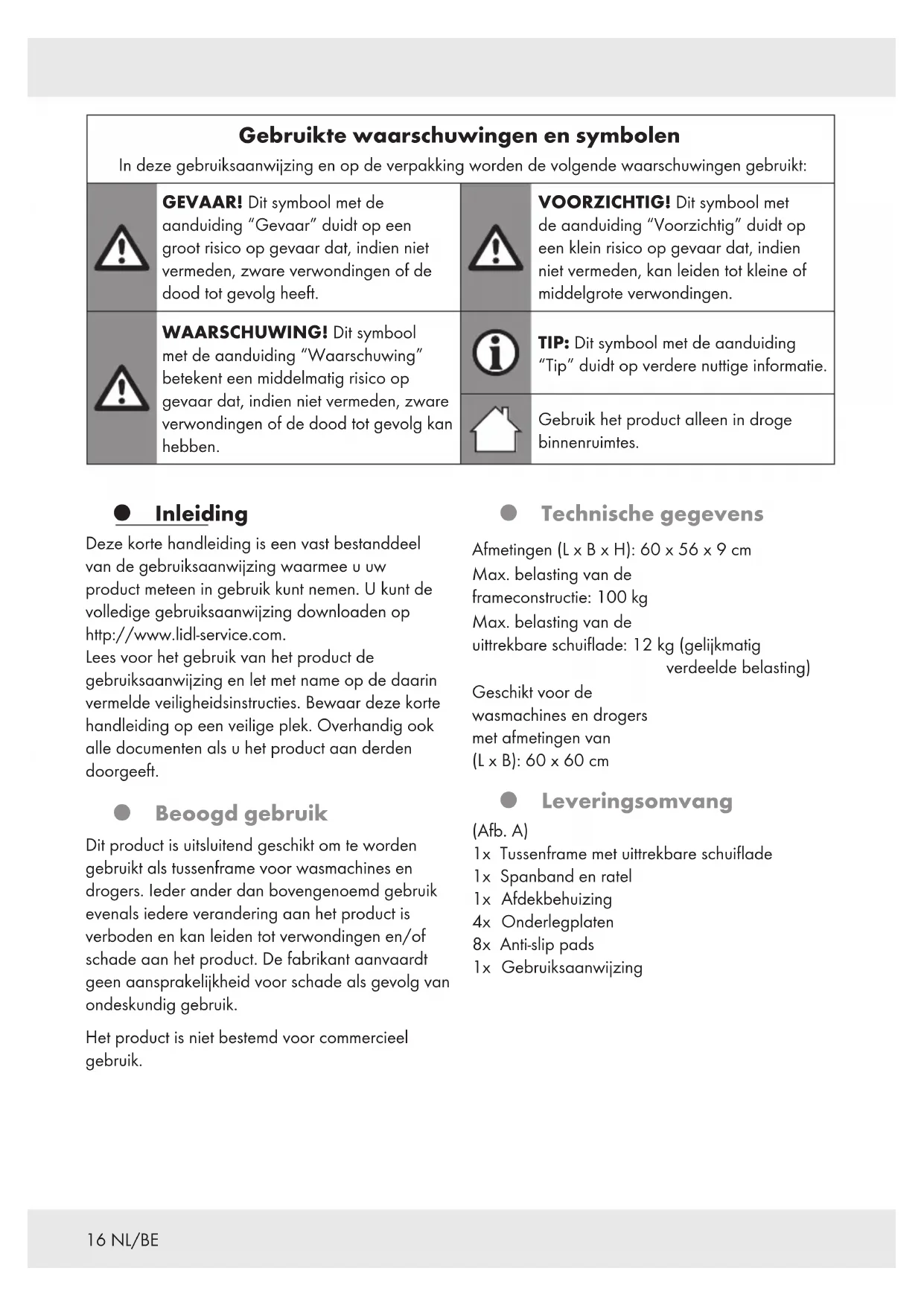 Nettoyage et entretien N'utilisez jamais de produits de nettoyage soit agressifs soit récurants ou de brosses dures pour nettoyer le produit. Essuyez le produit avec un chiffon légèrement humidifié. Utilisez un liquide vaisselle doux pour la saleté tenace. Après le nettoyage: Laissez les pièces sécher.16 NL/BE Gebruikte waarschuwingen en symbolen In deze gebruiksaanwijzing en op de verpakking worden de volgende waarschuwingen gebruikt: GEVAAR! Dit symbool met de aanduiding “Gevaar” duidt op een groot risico op gevaar dat, indien niet vermeden, zware verwondingen of de dood tot gevolg heeft. VOORZICHTIG! Dit symbool met de aanduiding “Voorzichtig” duidt op een klein risico op gevaar dat, indien niet vermeden, kan leiden tot kleine of middelgrote verwondingen. WAARSCHUWING! Dit symbool met de aanduiding “Waarschuwing” betekent een middelmatig risico op gevaar dat, indien niet vermeden, zware verwondingen of de dood tot gevolg kan hebben. TIP: Dit symbool met de aanduiding “Tip” duidt op verdere nuttige informatie. Gebruik het product alleen in droge binnenruimtes. Inleiding Deze korte handleiding is een vast bestanddeel van de gebruiksaanwijzing waarmee u uw product meteen in gebruik kunt nemen. U kunt de volledige gebruiksaanwijzing downloaden op http://www.lidl-service.com. Lees voor het gebruik van het product de gebruiksaanwijzing en let met name op de daarin vermelde veiligheidsinstructies. Bewaar deze korte handleiding op een veilige plek. Overhandig ook alle documenten als u het product aan derden doorgeeft. Beoogd gebruik Dit product is uitsluitend geschikt om te worden gebruikt als tussenframe voor wasmachines en drogers. Ieder ander dan bovengenoemd gebruik evenals iedere verandering aan het product is verboden en kan leiden tot verwondingen en/of schade aan het product. De fabrikant aanvaardt geen aansprakelijkheid voor schade als gevolg van ondeskundig gebruik. Het product is niet bestemd voor commercieel gebruik. Technische gegevens Afmetingen (LxBxH): 60x56x9cm Max. belasting van de frameconstructie: 100kg Max. belasting van de uittrekbare schuiflade: 12kg (gelijkmatig verdeelde belasting) Geschikt voor de wasmachines en drogers met afmetingen van (LxB): 60x60cm Leveringsomvang (Afb.A) 1x Tussenframe met uittrekbare schuiflade 1x Spanband en ratel 1x Afdekbehuizing 4x Onderlegplaten 8x Anti-slip pads 1x Gebruiksaanwijzing17NL/BE Veiligheidstips