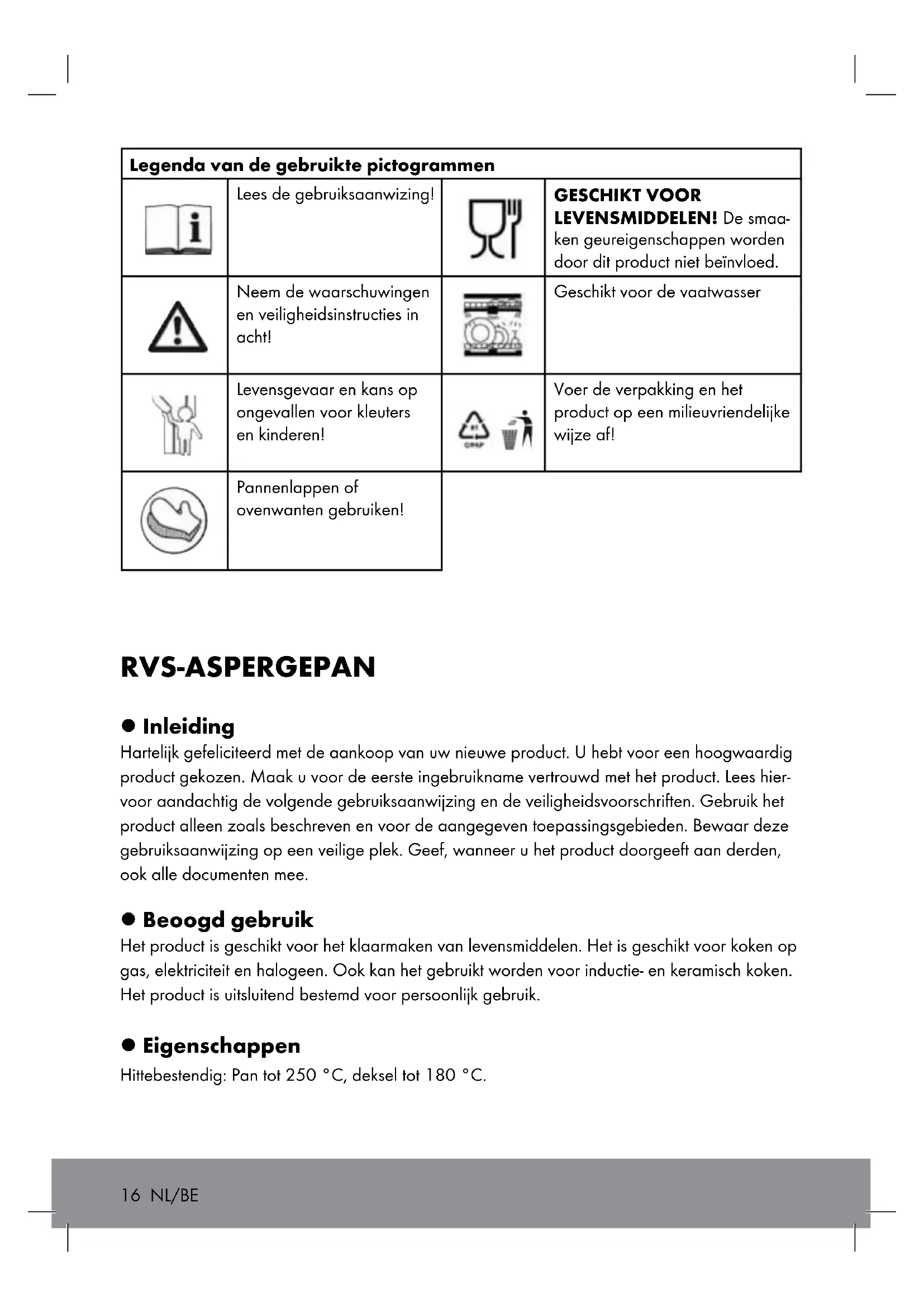 Service Gurris GmbH Gaußstr. 10 68165 Mannheim ALLEMAGNE +49 621 43223-20 team.lidl@gurris.de IAN 388867_2107 FR/BE 1516 NL/BE RVS-ASPERGEPAN l Inleiding Hartelijk gefeliciteerd met de aankoop van uw nieuwe product. U hebt voor een hoogwaardig product gekozen. Maak u voor de eerste ingebruikname vertrouwd met het product. Lees hier- voor aandachtig de volgende gebruiksaanwijzing en de veiligheidsvoorschriften. Gebruik het product alleen zoals beschreven en voor de aangegeven toepassingsgebieden. Bewaar deze gebruiksaanwijzing op een veilige plek. Geef, wanneer u het product doorgeeft aan derden, ook alle documenten mee. l Beoogd gebruik Het product is geschikt voor het klaarmaken van levensmiddelen. Het is geschikt voor koken op gas, elektriciteit en halogeen. Ook kan het gebruikt worden voor inductie- en keramisch koken. Het product is uitsluitend bestemd voor persoonlijk gebruik. l Eigenschappen Hittebestendig: Pan tot 250 °C, deksel tot 180 °C. Legenda van de gebruikte pictogrammen Lees de gebruiksaanwizing! GESCHIKT VOOR LEVENSMIDDELEN! De smaa- ken geureigenschappen worden door dit product niet beïnvloed. Neem de waarschuwingen en veiligheidsinstructies in acht! Geschikt voor de vaatwasser Levensgevaar en kans op ongevallen voor kleuters en kinderen! Voer de verpakking en het product op een milieuvriendelijke wijze af! Pannenlappen of ovenwanten gebruiken!NL/BE 17 l Veiligheidsinstructies