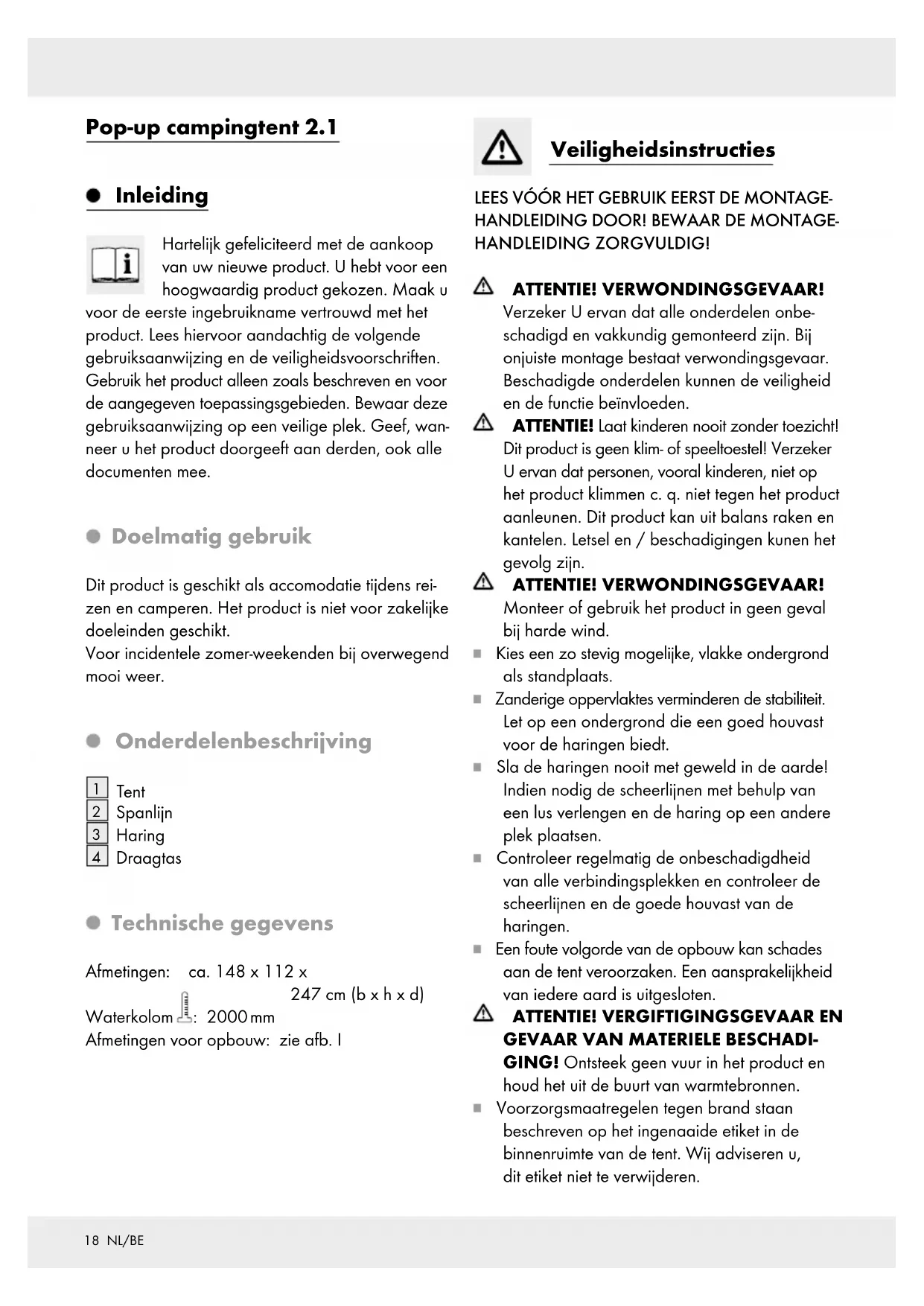 GING! Ontsteek geen vuur in het product en houd het uit de buurt van warmtebronnen. Voorzorgsmaatregelen tegen brand staan beschreven op het ingenaaide etiket in de binnenruimte van de tent. Wij adviseren u, dit etiket niet te verwijderen.19 NL/BE Informeer u bovendien over de brandvoorschrif- ten ter plaatse (b. v. camping, kampeerterrein). Zorg ervoor dat de ventilatieopeningen (ook bij de ingang) te allen tijde geopend zijn om verstikking te voorkomen. Houd de uitgang vrij! Plaats geen voorwerpen voor de uitgang. VERSTIKKINGS- GEVAAR! Als gevolg van een gebrekkige ventilatie van de binnenkant van de tent be- staat kans op verstikking. Voorzorgsmaatregelen tegen brand Kampeer op een veilige manier Volg deze voorschriften met gezond verstand op: Plaats geen hete apparatuur in de buurt van wanden, daken of gordijnen. Neem altijd de veiligheidsinstructies voor dit soort apparatuur in acht. Laat geen kinderen in de buurt van hete appa- ratuur spelen. Laat alle doorgangen vrij. Belemmer de uitgang niet met obstakels. Zorg dat u op de hoogte bent van de voor- zorgsmaatregelen tegen brand op het terrein. Let op het weer en de invloed van de weersgesteldheid Houd bij de keuze van de standplaats steeds rekening met de omstandigheden ter plaatse c.q. hoe deze eventueel kunnen veranderen. Ligt de plaats zo dat deze gedurende regen niet in een meer verandert? Houd rekening met eventueel stijgende rivieren en getijden. Bescherm het product tegen harde wind en storm. Plaats het product op een zo windbeschermde plek als mogelijk. Ruil bij sterke wind de normale haringen tegen speciale stormharingen. Informeer u over nuttige aanvullende producten in de gespecialiseerde winkel. Breek de tent voor sterke sneeuwval of storm af. Verwijder sneeuw direct van het product. Anders kan het product onder het gewicht ineenzakken. Zet de tent niet te strak op, aangezien het zich dan niet aan de wisselende weersomstandigheden kan aanpassen en beschadigd kan worden. Ritssluitingen zijn aan slijtage onderhevig en vallen niet onder de garantievoorwaarden. Het tentdoek is vervaardigd van waterafstotend polyestermateriaal. Het is mogelijk dat de tent na een eerste regen niet volledig waterdicht is. Door de natheid trekken de draden van het tentdoek echter aan, zodat de tent na een korte tijd waterdicht is. Bij vocht en regen zetten de stoffen van de tent op verschillende manieren uit en zorgen ervoor dat de scheerlijnen opnieuw gespannen moeten worden. Als het materiaal gedurende het drogen weer verstrakt, moeten de scheerlijnen op tijd weer losser gemaakt worden. Gebruik geen insectenspray in of op de tent. Kleine ondichte plekken aan de naden kunnen met een nadenspray hersteld worden en voor de tenthuid kan een impregneerspray worden gebruikt. Montage Zorg dat het product alleen door een deskundig persoon wordt gemonteerd / gedemonteerd. Tent opbouwen ATTENTION: houd er alstublieft rekening mee, dat de stangen onder spanning staan en altijd in de natuurlijke vorm van de tent springen. Let op, dat u niet gewond raakt door de spankracht. Verwijder het elastiek en gooi het product uit uw richting in de lucht. Zet de tent met de scheerlijnen