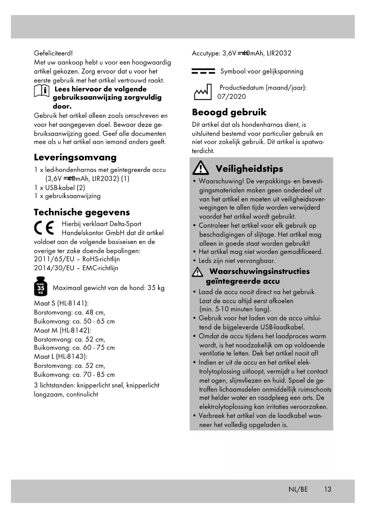 Maximaal gewicht van de hond: 35 kg Maat S (HL-8141): Borstomvang: ca. 48 cm, Buikomvang: ca. 50 - 65 cm Maat M (HL-8142): Borstomvang: ca. 52 cm, Buikomvang: ca. 60 - 75 cm Maat L (HL-8143): Borstomvang: ca. 52 cm, Buikomvang: ca. 70 - 85 cm 3 lichtstanden: knipperlicht snel, knipperlicht langzaam, continulicht Accutype: 3,6V 40mAh, LIR2032 Symbool voor gelijkspanning Productiedatum (maand/jaar): 07/2020 Beoogd gebruik Dit artikel dat als hondenharnas dient, is uitsluitend bestemd voor particulier gebruik en niet voor zakelijk gebruik. Dit artikel is spatwa- terdicht. Veiligheidstips