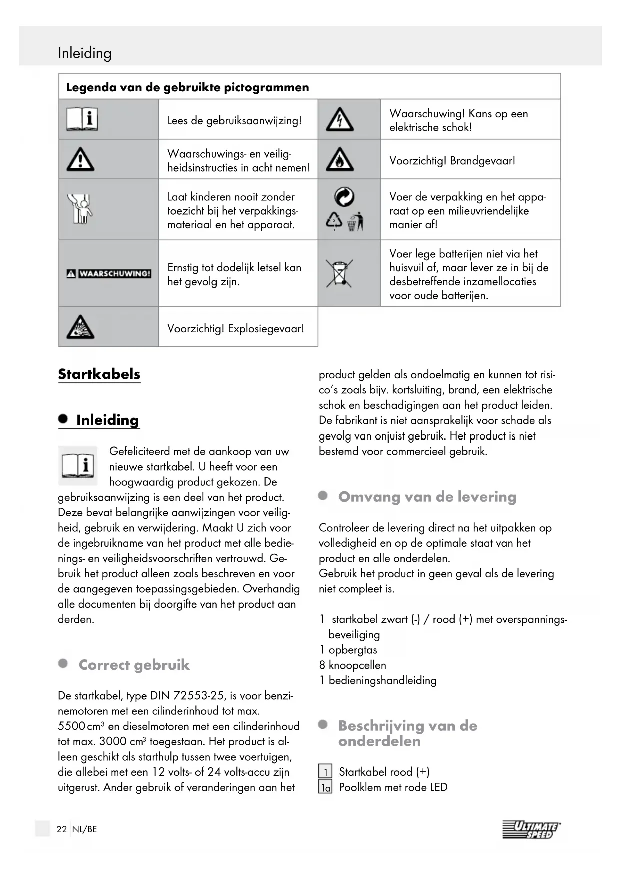 Voer de verpakking en het appa- raat op een milieuvriendelijke manier af! Ernstig tot dodelijk letsel kan het gevolg zijn. Voer lege batterijen niet via het huisvuil af, maar lever ze in bij de desbetreffende inzamellocaties voor oude batterijen. Voorzichtig! Explosiegevaar! Startkabels Inleiding Gefeliciteerd met de aankoop van uw nieuwe startkabel. U heeft voor een hoogwaardig product gekozen. De gebruiksaanwijzing is een deel van het product. Deze bevat belangrijke aanwijzingen voor veilig- heid, gebruik en verwijdering. Maakt U zich voor de ingebruikname van het product met alle bedie- nings- en veiligheidsvoorschriften vertrouwd. Ge- bruik het product alleen zoals beschreven en voor de aangegeven toepassingsgebieden. Overhandig alle documenten bij doorgifte van het product aan derden. Correct gebruik De startkabel, type DIN 72553-25, is voor benzi- nemotoren met een cilinderinhoud tot max. 5500 cm
