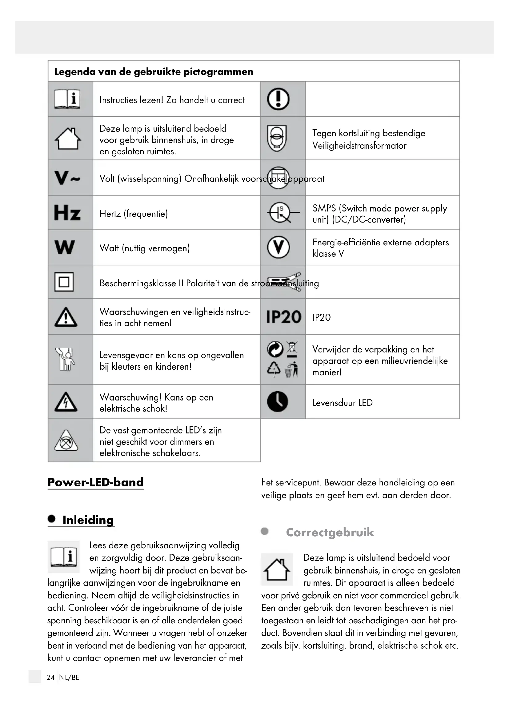 Verwijder de verpakking en het apparaat op een milieuvriendelijke manier! Waarschuwing! Kans op een elektrische schok! Levensduur LED De vast gemonteerde LED’s zijn niet geschikt voor dimmers en elektronische schakelaars. Power-LED-band Inleiding Lees deze gebruiksaanwijzing volledig en zorgvuldig door. Deze gebruiksaan- wijzing hoort bij dit product en bevat be- langrijke aanwijzingen voor de ingebruikname en bediening. Neem altijd de veiligheidsinstructies in acht. Controleer vóór de ingebruikname of de juiste spanning beschikbaar is en of alle onderdelen goed gemonteerd zijn. Wanneer u vragen hebt of onzeker bent in verband met de bediening van het apparaat, kunt u contact opnemen met uw leverancier of met het servicepunt. Bewaar deze handleiding op een veilige plaats en geef hem evt. aan derden door. Correct gebruik Deze lamp is uitsluitend bedoeld voor gebruik binnenshuis, in droge en gesloten ruimtes. Dit apparaat is alleen bedoeld voor privé gebruik en niet voor commercieel gebruik. Een ander gebruik dan tevoren beschreven is niet toegestaan en leidt tot beschadigingen aan het pro- duct. Bovendien staat dit in verbinding met gevaren, zoals bijv. kortsluiting, brand, elektrische schok etc.25 NL/BE Inleiding / VeiligheidInleiding Omvang van de levering Controleer de levering altijd direct na het uitpakken op volledigheid en optimale staat van het product. 1 Power-LED-Band 1 Kabelhouder 1 Kleefband 1 Gebruiksaanwijzing Beschrijving van de onderdelen