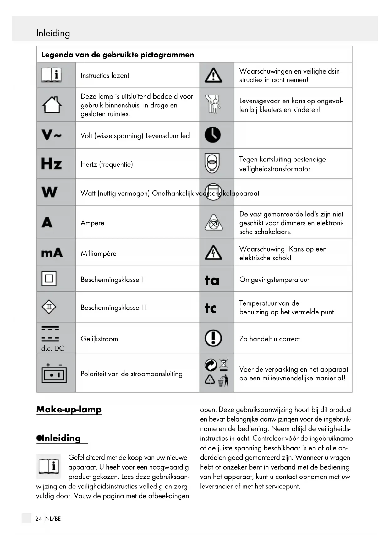 4,8 W DC 24 V, max. 0,2 A Beschermingsklasse: II / Led is niet vervangbaar Veiligheid Veiligheidsinstructies Bij schade die ontstaat door het negeren van deze gebruiksaanwijzing komt de garantie te vervallen! Wij zijn niet aansprakelijk voor gevolgschade! Bij materiële schade of persoonlijk letsel dat wordt ver- oorzaakt door onjuist gebruik of het negeren van de veiligheidsinstructies zijn wij niet aansprakelijk!
