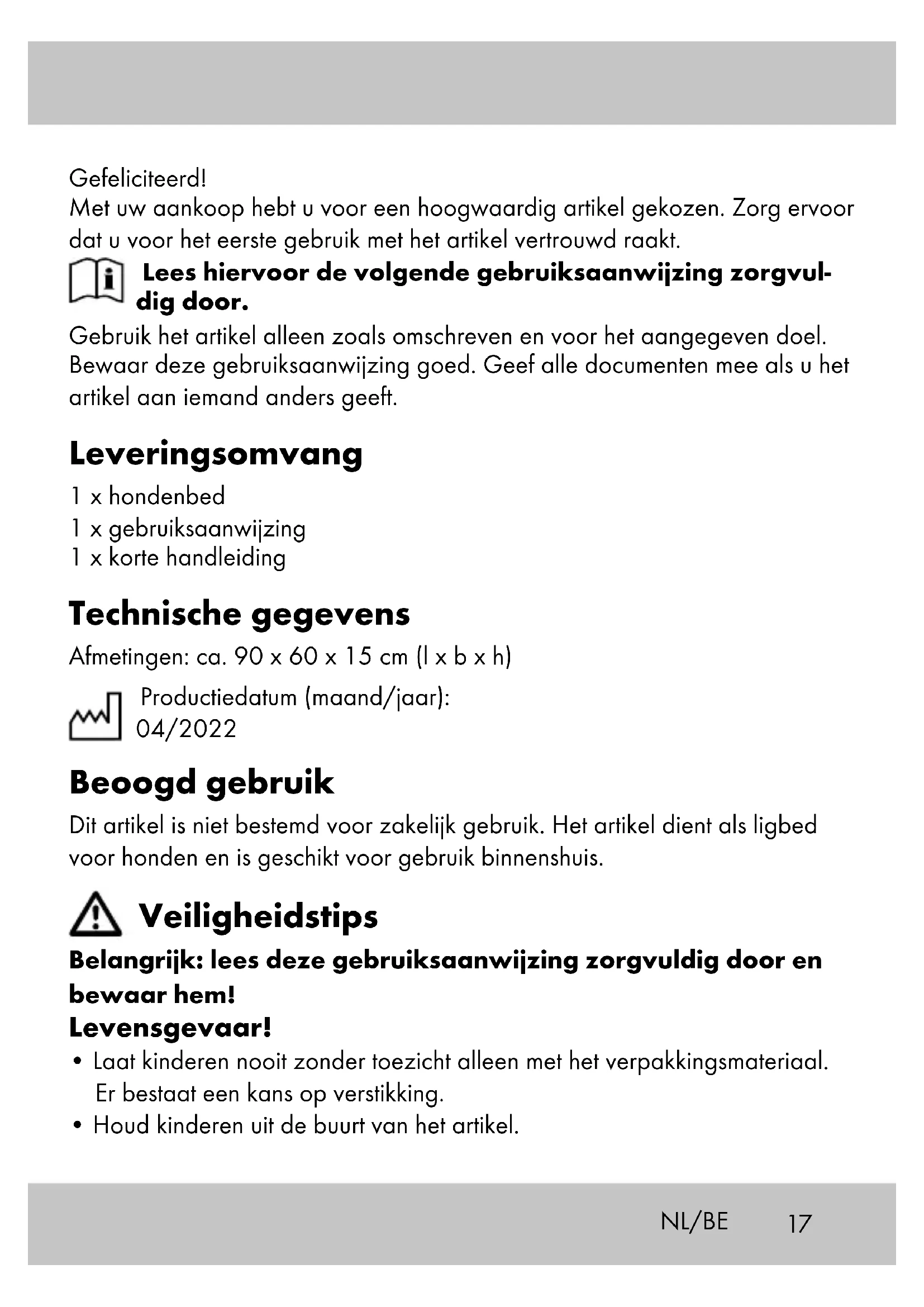 - Het artikel mag alleen worden gebruikt voor het beoogde doel. Gebruik (afb. A) Het artikel beschikt over een verwarmend en een koelend ligvlak. Koelend oppervlak: klein ruitpatroon Verwarmend oppervlak: groot ruitpatroon Aanwijzing: het verwarmende ligvlak bevat de ritselende folie. Deze speciale folie reflecteert de door de hond afgegeven lichaamswarmte. De koelende zijde absorbeert de lichaamswarmte van de hond. Reiniging en onderhoud Bewaar het artikel wanneer u dit niet gebruikt altijd droog en schoon op kamertemperatuur. Schud het artikel regelmatig uit en zuig het schoon. Reinig het niet met agressieve schoonmaakmiddelen. Grove vervuiling kunt u met een vochtige schoonmaakdoek verwijderen. Om het artikel beter te reinigen kunt u de rits ervan openen en het binnenkussen verwijderen. Laat het artikel na de reiniging volledig drogen en plaats het binnenkussen terug. NL/BE19NL/BE Afvalverwerking Voer het artikel en verpakkingsmaterialen in overeenstemming met actuele lokale voorschriften af. Verpakkingsmaterialen, zoals bv. foliezakjes, horen niet thuis in kinderhanden. Berg het verpakkingsmateriaal buiten het bereik van kinderen op. Voer de producten en verpakkingen op milieuvriendelijke wijze af. De recyclingcode dient om verschillende materialen te kenmerken ten behoeve van hergebruik via het recyclingproces. De code bestaat uit het recyclingsymbool, dat het recyclingproces weerspiegelt, en een getal dat het materiaal identificeert. Opmerkingen over garantie en serviceafhandeling Het artikel werd met de grootste zorgvuldigheid en onder permanent toezicht geproduceerd. De firma DELTA-SPORT HANDELSKONTOR GmbH verleent particuliere eindklanten op dit artikel drie jaar garantie, te rekenen vanaf de datum van aankoop (garantietermijn) en dit op grond van de volgende bepa- lingen. De garantie geldt alleen voor materiaal- en verwerkingsfouten. De garantie is niet van toepassing op onderdelen die aan een normale slijtage onderhevig zijn en daarom als niet-slijtvaste onderdelen te beschouwen zijn (bv. batterijen) en evenmin op breekbare onderdelen, bv. schakelaars, accu’s of onderdelen die van glas gemaakt zijn. Uit de garantie voortvloeiende claims zijn uitgesloten als het artikel onvakkun- dig, verkeerd of niet in het kader van de voorziene bepaling of in het kader van het voorziene gebruiksdoeleinde gebruikt werd of indien richtlijnen in de gebruiksaanwijzing niet in acht genomen werden, tenzij de eindklant aantoont dat er sprake is van een materiaal- of verwerkingsfout die niet op één van de hoger vermelde omstandigheden gebaseerd is.20 Uit de garantie voortvloeiende claims kunnen alleen tijdens de garantiepe- riode op vertoon van de originele kassabon ingediend worden. Gelieve daarom de originele kassabon te bewaren. De garantieperiode wordt door eventuele reparaties op grond van de garantie, wettelijke waarborg of coulance niet verlengd. Dit geldt ook voor vervangen en gerepareerde onderdelen. Gelieve u bij klachten in eerste instantie tot de hieronder vermelde servicehot- line te richten of met ons per e-mail contact op te nemen. Is er sprake van een garantiegeval, dan wordt het artikel door ons – naar onze keuze – voor u gratis gerepareerd, wordt het vervangen of wordt de aankoopsom terugbe- taald. Verdere rechten op grond van de garantie bestaan niet. Uw wettelijke rechten, in het bijzonder rechten op garantie tegenover de betreffende verkoper, worden door deze garantie niet beperkt. IAN: 378710_2110 Service België Tel.: 070 270 171 (0,15 EUR/Min.) E-Mail: deltasport@lidl.be Service Nederland Tel.: 08000249630 E-Mail: deltasport@lidl.nl NL/BE21 Gratulujemy! Decydując się na ten produkt, otrzymują Państwo towar wysokiej jakości. Należy zapoznać się z produktem przed jego pierwszym użyciem. Należy uważnie przeczytać następującą instrukcję użytkowania. Produkt ten należy użytkować wyłącznie w opisany sposób oraz zgodnie ze wskazanym przeznaczeniem. Niniejszą instrukcję użytkowania należy prze- chowywać w bezpiecznym miejscu. Przekazując produkt innej osobie, należy upewnić się, że otrzyma ona także całą dokumentację dotyczącą produktu. Zakres dostawy 1 x legowisko dla psa 1 x instrukcja użytkowania 1 x skrócona instrukcja Dane techniczne Wymiary: ok. 90 x 60 x 15 cm (dł. x szer. x wys.) Data produkcji (miesiąc/rok): 04/2022 Użytkowanie zgodne z przeznaczeniem Produkt ten nie jest przeznaczony do użytku komercyjnego. Produkt służy jako legowisko dla psów w pomieszczeniach. Wskazówki bezpieczeństwa Ważne: należy uważnie przeczytać instrukcję obsługi i zacho- wać ją do późniejszego użytku! Zagrożenie życia!