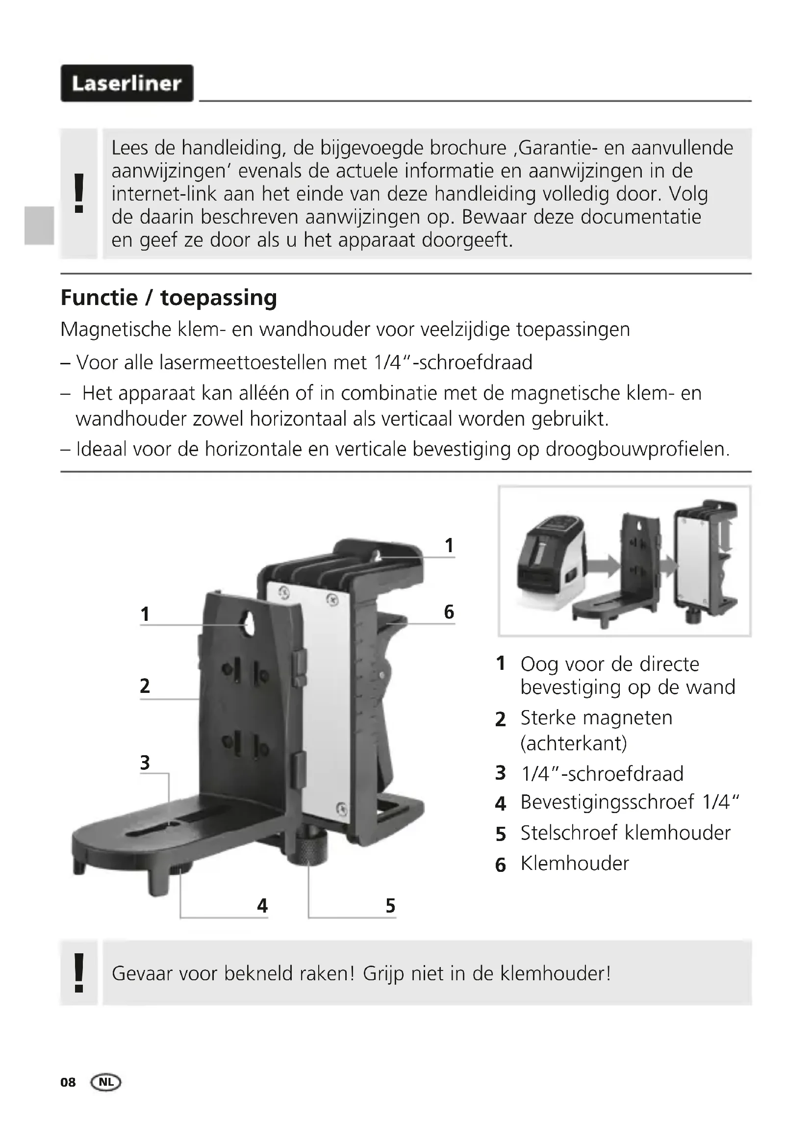 Functie / toepassing Magnetische klem- en wandhouder voor veelzijdige toepassingen – Voor alle lasermeettoestellen met 1/4“-schroefdraad – Het apparaat kan alléén of in combinatie met de magnetische klem- en wandhouder zowel horizontaal als verticaal worden gebruikt. – Ideaal voor de horizontale en verticale bevestiging op droogbouwproelen. Lees de handleiding, de bijgevoegde brochure ‚Garantie- en aanvullende aanwijzingen‘ evenals de actuele informatie en aanwijzingen in de internet-link aan het einde van deze handleiding volledig door. Volg de daarin beschreven aanwijzingen op. Bewaar deze documentatie en geef ze door als u het apparaat doorgeeft.