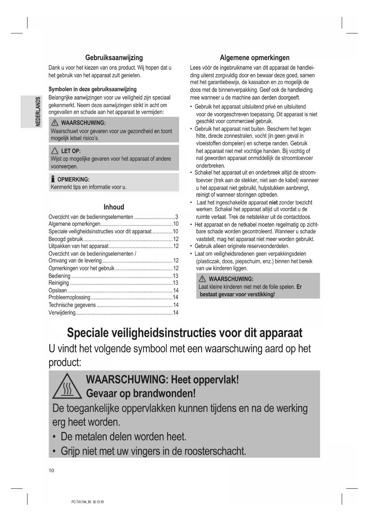 wanneer beschadingen worden geconstateerd, het apparaat niet gebruiken. Breng het apparaat terug naar de leverancier. OPMERKING: Er kan stof en productieresidu op het apparaat aanwezig zijn. We raden u aan het apparaat reinigen zoals beschre- ven in het hoofdstuk “Reiniging”. Overzicht van de bedieningselementen / Omvang van de levering 1 Broodsleuven 2 Afneembaar broodjesrek 3 Behuizing 4 Kruimel lade 5 Broodlift 6 Weergave “Bruiningsgraad” 7 Regelknop “Bruiningsgraad” 8 DEFROST toets “Ontdooien“ (met indicatielampje) 9 REHEAT toets “Opwarmen“ (met indicatielampje) 10 CANCEL toets “Stop“ (met indicatielampje) Opmerkingen voor het gebruik Voor het eerste gebruik LET OP: Voor de verwijdering van de beschermlaag aan de verwarmingsspiraal dient u het apparaat drie keer zonder enig product in te schakelen. Kies hiervoor de hoogste bruiningsgraad. OPMERKING: Lichte rook- en stankontwikkeling zijn bij deze procedure normaal. Zorg voor voldoende ventilatie. Netkabel Rol de netkabel volledig af. Voer het snoer door de geleider aan de rechterkant van het apparaat. Elektrische aansluiting Controleer of de netspanning die u wilt gebruiken overeen- komt met die van het apparaat. U vindt de informatie ervan op het typeplaatje.PC-TA1194_IM 30.10.19
