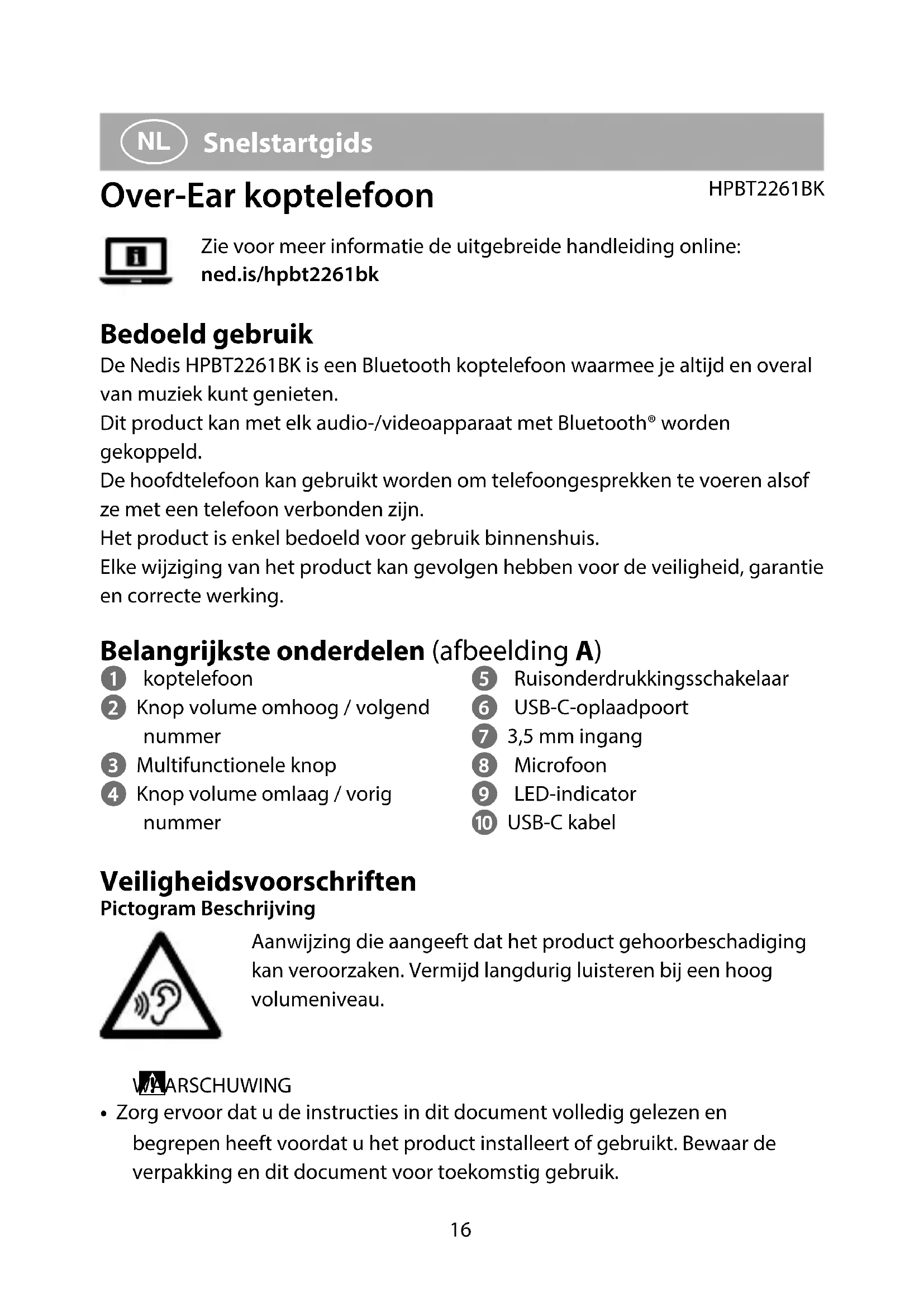 Snelstartgids Over-Ear koptelefoon HPBT2261BKZie voor meer informatie de uitgebreide handleiding online: ned.is/hpbt2261bk Bedoeld gebruik De Nedis HPBT2261BK is een Bluetooth koptelefoon waarmee je altijd en overal van muziek kunt genieten.Dit product kan met elk audio-/videoapparaat met Bluetooth® worden gekoppeld.De hoofdtelefoon kan gebruikt worden om telefoongesprekken te voeren alsof ze met een telefoon verbonden zijn.Het product is enkel bedoeld voor gebruik binnenshuis.Elke wijziging van het product kan gevolgen hebben voor de veiligheid, garantie en correcte werking. Belangrijkste onderdelen (afbeelding A) 1 koptelefoon 2 Knop volume omhoog / volgend nummer 3 Multifunctionele knop 4 Knop volume omlaag / vorig nummer 5 Ruisonderdrukkingsschakelaar 6 USB-C-oplaadpoort 7 3,5 mm ingang 8 Microfoon 9 LED-indicator q USB-C kabel Veiligheidsvoorschriften Pictogram BeschrijvingAanwijzing die aangeeft dat het product gehoorbeschadiging kan veroorzaken. Vermijd langdurig luisteren bij een hoog volumeniveau. WAARSCHUWING• Zorg ervoor dat u de instructies in dit document volledig gelezen en begrepen heeft voordat u het product installeert of gebruikt. Bewaar de verpakking en dit document voor toekomstig gebruik.17