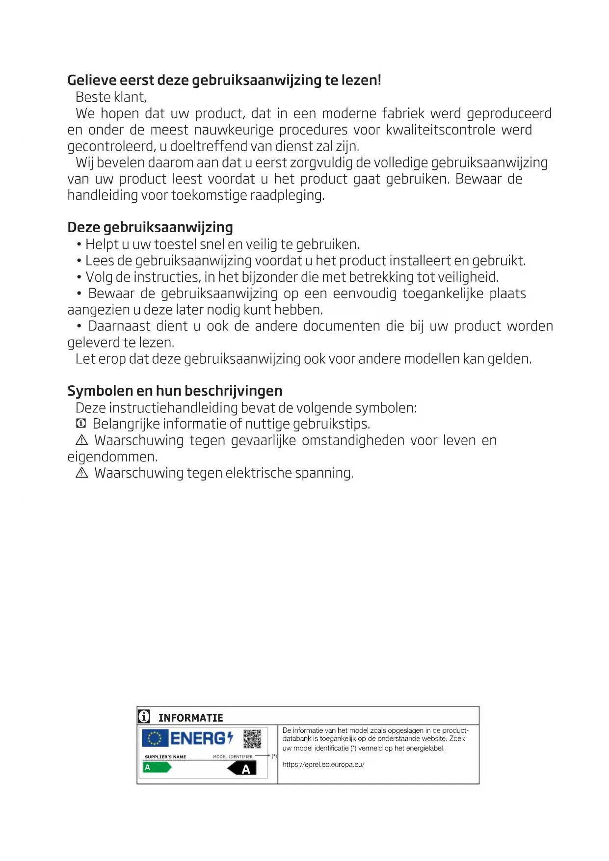 van hoge kwaliteit die hergebruikt kunnen worden en geschikt zijn voor reclycling. Gooi het restproduct aan het einde van zijn levensduur niet weg bij normaal huishoudelijk of ander afval. Breng het naar het verzamelpunt voor recycling van elektrische en elektronische apparatuur. Raadpleeg uw plaatselijke autoriteiten om te weten waar u deze verzamelpunten aantreft. Voldoet aan RoHS-richtlijn: Het door u aangekochte product voldoet aan de EU- richtlijn RoHS (2011/65/EU). Het bevat geen schadelijke en verboden materialen die in deze richtlijn zijn opgenomen. HC-waarschuwing Als het koelsysteem van uw product R600a bevat: Dit gas is ontvlambaar. Zorg daarom tijdens gebruik en transport dat het koelsysteem en de leidingen niet beschadigd raken. In het geval van schade: houd uw product weg van mogelijke ontstekingsbronnen die kunnen veroorzaken dat het product vuur vat en ventileer de ruimte waarin de unit is geplaatst. Negeer deze waarschuwing als het koelsysteem van uw product R134a bevat. Het type gas dat in dit product wordt gebruikt staat vermeld op de type-etiket aan de linkerwand binnenin de koelkast. Gooi het product nooit in vuur voor verwijdering. Aanwijzingen ter besparing van energie