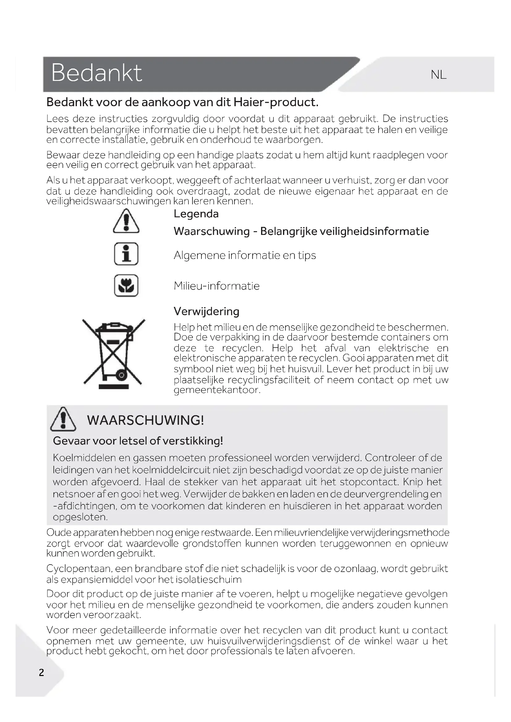 Bedankt Ëèçäñî÷ùòòõçèääñîòòóùäñçì÷Ñäìèõ¡óõòçøæ÷ Lees deze instructies zorgvuldig door voordat u dit apparaat gebruikt. De instructies bevatten belangrijke informatie die u helpt het beste uit het apparaat te halen en veilige en correcte installatie, gebruik en onderhoud te waarborgen. Bewaar deze handleiding op een handige plaats zodat u hem altijd kunt raadplegen voor een veilig en correct gebruik van het apparaat. Als u het apparaat verkoopt, weggeeft of achterlaat wanneer u verhuist, zorg er dan voor dat u deze handleiding ook overdraagt, zodat de nieuwe eigenaar het apparaat en de veiligheidswaarschuwingen kan leren kennen. Õèêèñçä àääõöæëøúìñê¡ Ëèïäñêõìíîèùèìïìêëèìçöìñéòõðä÷ìè Algemene informatie en tips Milieu-informatie ßèõúìíçèõìñê Help het milieu en de menselijke gezondheid te beschermen. Doe de verpakking in de daarvoor bestemde containers om deze te recyclen. Help het afval van elektrische en elektronische apparaten te recyclen. Gooi apparaten met dit symbool niet weg bij het huisvuil. Lever het product in bij uw plaatselijke recyclingsfaciliteit of neem contact op met uw gemeentekantoor. àÊÊÛÜÌÑÞàÒ×Ð Ðèùääõùòòõ ïè÷öèïòéùèõö÷ìîîìñê Koelmiddelen en gassen moeten professioneel worden verwijderd. Controleer of de leidingen van het koelmiddelcircuit niet zijn beschadigd voordat ze op de juiste manier worden afgevoerd. Haal de stekker van het apparaat uit het stopcontact. Knip het netsnoer af en gooi het weg. Verwijder de bakken en laden en de deurvergrendeling en -afdichtingen, om te voorkomen dat kinderen en huisdieren in het apparaat worden opgesloten. Oude apparaten hebben nog enige restwaarde. Een milieuvriendelijke verwijderingsmethode zorgt ervoor dat waardevolle grondstoffen kunnen worden teruggewonnen en opnieuw kunnen worden gebruikt. Cyclopentaan, een brandbare stof die niet schadelijk is voor de ozonlaag, wordt gebruikt als expansiemiddel voor het isolatieschuim Door dit product op de juiste manier af te voeren, helpt u mogelijke negatieve gevolgen voor het milieu en de menselijke gezondheid te voorkomen, die anders zouden kunnen worden veroorzaakt. Voor meer gedetailleerde informatie over het recyclen van dit product kunt u contact opnemen met uw gemeente, uw huisvuilverwijderingsdienst of de winkel waar u het product hebt gekocht, om het door professionals te laten afvoeren.Veiligheidsinformatie