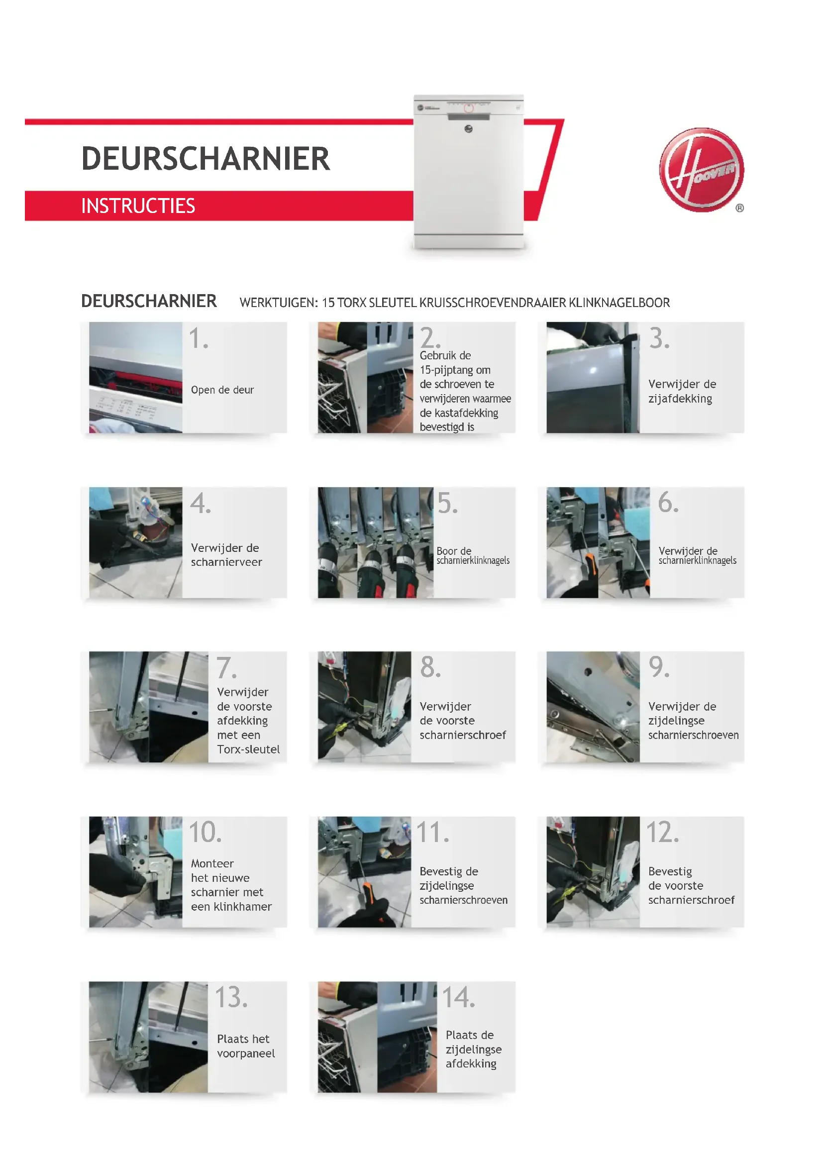 Verwijder de voorste afdekking met een Torx-sleutelVerwijder de voorste scharnierschroef Verwijder de zijdelingse scharnierschroeven Monteer het nieuwe scharnier met een klinkhamer