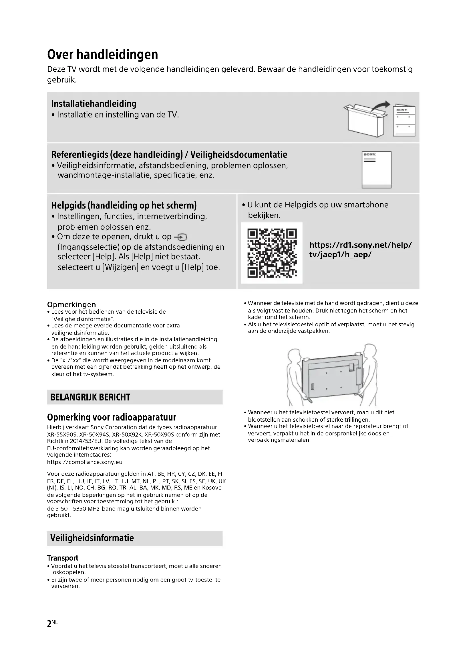 - De "x"/"xx" die wordt weergegeven in de modelnaam komt overeen met een cijfer dat betrekking heeft op het ontwerp, de kleur of het tv-systeem. Opmerking voor radioapparatuur Hierbij verklaart Sony Corporation dat de types radioapparatuur XR-55X90S, XR-50X94S, XR-50X92K, XR-50X90S conform zijn met Richtlijn 2014/53/EU. De volledige tekst van de EU-conformiteitsverklaring kan worden geraadpleegd op het volgende internetadres: https://compliance.sony.eu Voor deze radioapparatuur gelden in AT, BE, HR, CY, CZ, DK, EE, FI, FR, DE, EL, HU, IE, IT, LV, LT, LU, MT, NL, PL, PT, SK, SI, ES, SE, UK, UK (NI), IS, LI, NO, CH, BG, RO, TR, AL, BA, MK, MD, RS, ME en Kosovo de volgende beperkingen op het in gebruik nemen of op de voorschriften voor toestemming tot het gebruik : de 5150 - 5350 MHz-band mag uitsluitend binnen worden gebruikt. Transport