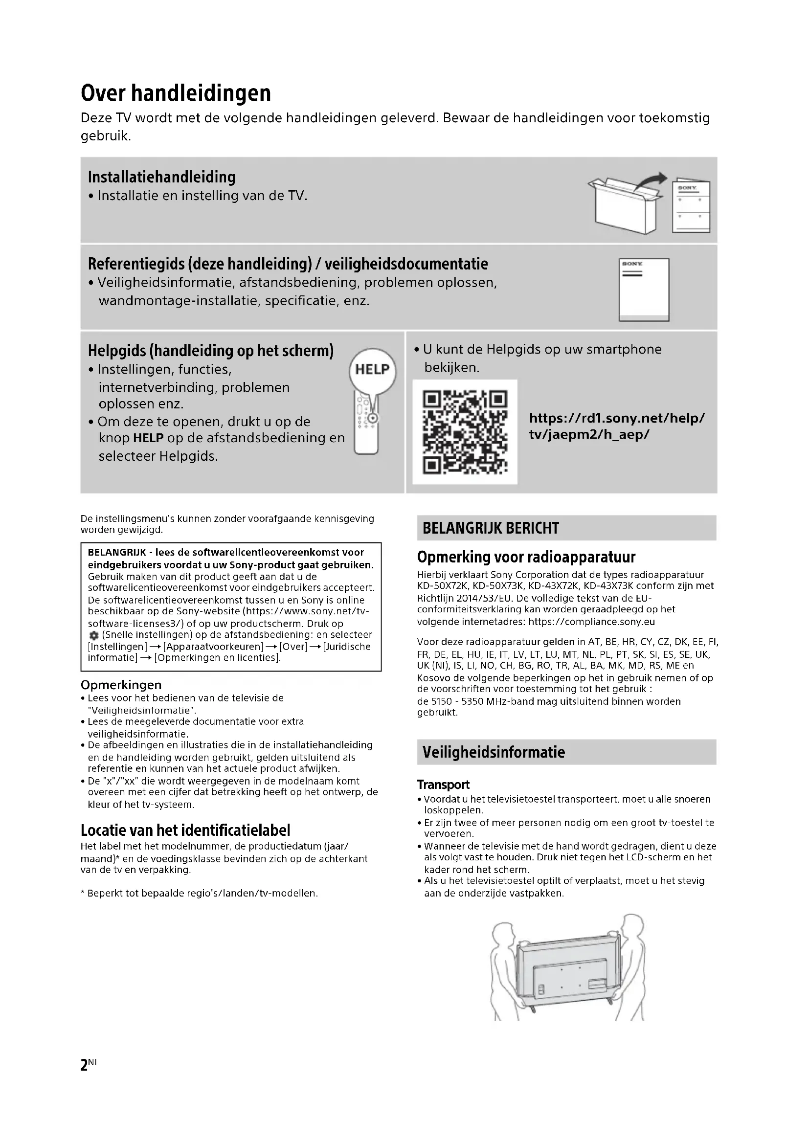 - Beperkt tot bepaalde regio's/landen/tv-modellen. Opmerking voor radioapparatuur Hierbij verklaart Sony Corporation dat de types radioapparatuur KD-50X72K, KD-50X73K, KD-43X72K, KD-43X73K conform zijn met Richtlijn 2014/53/EU. De volledige tekst van de EU- conformiteitsverklaring kan worden geraadpleegd op het volgende internetadres: https://compliance.sony.eu Voor deze radioapparatuur gelden in AT, BE, HR, CY, CZ, DK, EE, FI, FR, DE, EL, HU, IE, IT, LV, LT, LU, MT, NL, PL, PT, SK, SI, ES, SE, UK, UK (NI), IS, LI, NO, CH, BG, RO, TR, AL, BA, MK, MD, RS, ME en Kosovo de volgende beperkingen op het in gebruik nemen of op de voorschriften voor toestemming tot het gebruik : de 5150 - 5350 MHz-band mag uitsluitend binnen worden gebruikt. Transport