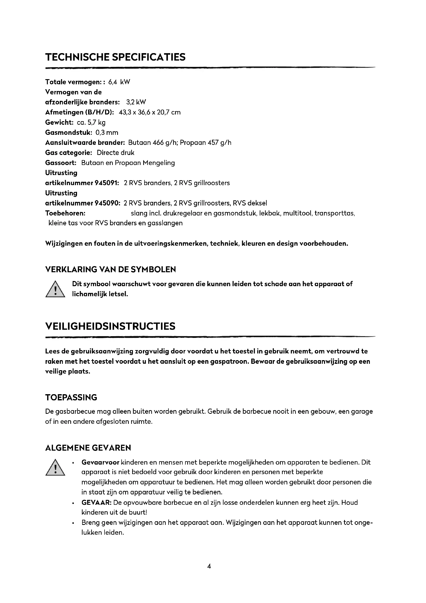 Dit symbool waarschuwt voor gevaren die kunnen leiden tot schade aan het apparaat of lichamelijk letsel. VEILIGHEIDSINSTRUCTIES Lees de gebruiksaanwijzing zorgvuldig door voordat u het toestel in gebruik neemt, om vertrouwd te raken met het toestel voordat u het aansluit op een gaspatroon. Bewaar de gebruiksaanwijzing op een veilige plaats. TOEPASSING De gasbarbecue mag alleen buiten worden gebruikt. Gebruik de barbecue nooit in een gebouw, een garage of in een andere afgesloten ruimte. ALGEMENE GEVAREN