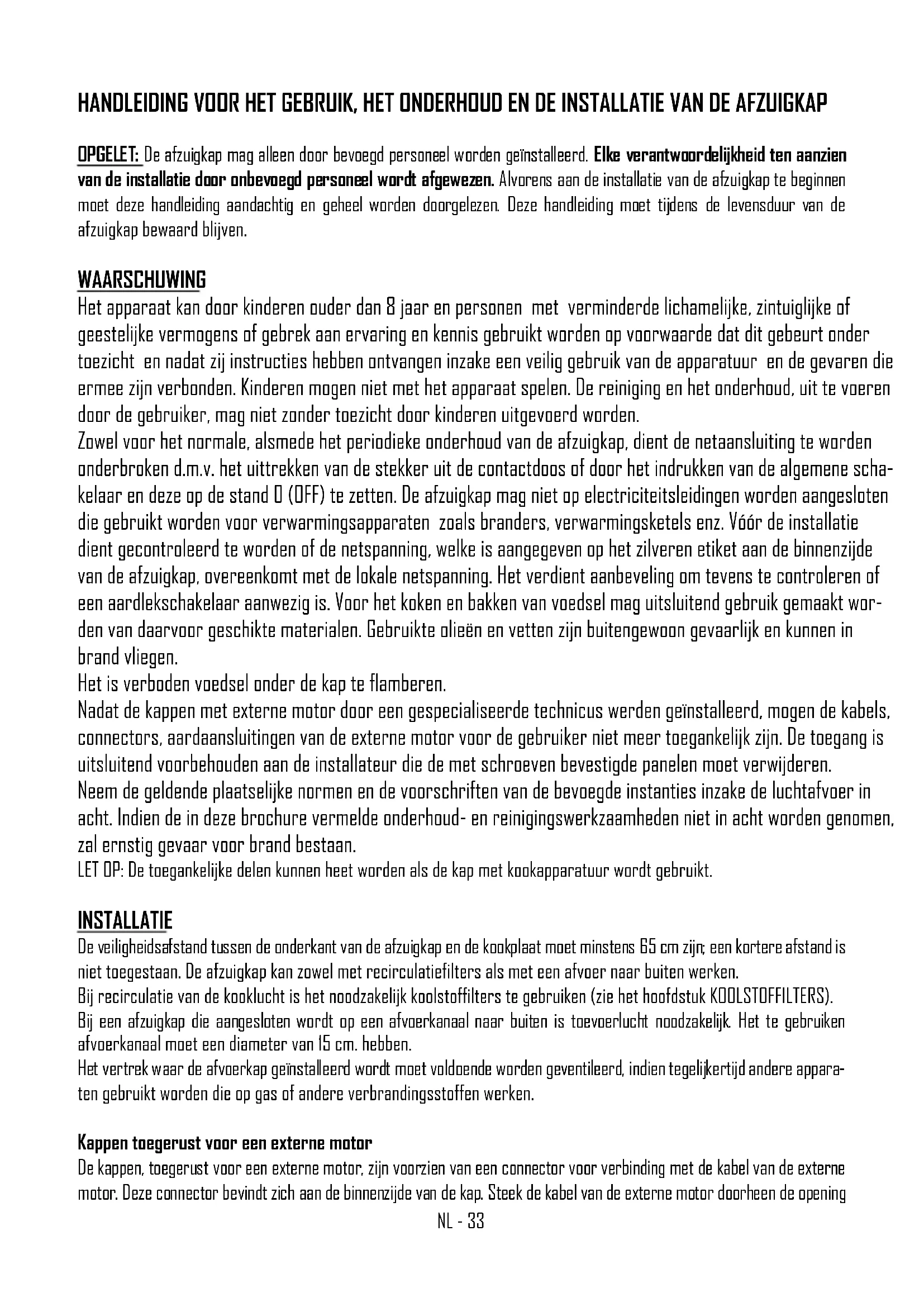 Avant d’effectuer toute intervention de nettoyage et de maintenance, couper l’alimentation de la hotte en mettant l'interrupteur général en position 0 (OFF). Remplacement des lampes Halogène 12V fixation G4: enlever avec un tournevis, l'anneau de support verre (Fig. 5). Enlever le verre et remplacer la lampe par une autre identique. Remonter le verre de protection et le fixer en insérant de nouveau l’anneau spécial. LesFR - 32 lampes peuvent être achetées Dichroïque lampe 12V fixation GU4: Utilisez un tournevis pour enlever et changer la lampe dichroïque avec une autre identique (Fig. 6) Spot à led : Le spot ne doit être remplacé que par des techniciens qualifiés et uniquement en utilisant des pièces de rechange originales. Nettoyage des filtres métalliques Les filtres métalliques en dotation avec la hotte doivent être lavés tous les 2-3 mois en fonction de l'intensité d’utilisation, avec de l’eau chaude et du détergent liquide non agressif. Les filtres métalliques doivent être enlevés en utilisant la poignée spéciale en décrochant en premier le filtre dans la partie avant en le tirant vers le bas (Fig. 7). Filtres au carbone Si la hotte est utilisée avec système filtrant avec recyclage interne, il est nécessaire d’employer des filtres au carbone qui contiennent du carbone actif. Le carbone actif contenu dans les filtres, sert à retenir les odeurs des fumées de cuisine. Pour l’enlèvement et le remplacement des filtres faire réf. à la fig. 8 Les filtres au carbone en POLYESTER ne peuvent pas être régénérés ou lavés et doivent être remplacés périodiquement (tous les 4 mois si on utilise la hotte pendant deux heures par jour). Les filtres saturés de graisses peuvent en effet être cause d’incendies. Sur la base du modèle de hotte, les filtres au carbone peuvent être de forme circulaire ou bien rectangu- laire. Le filtre à charbon LONG LIFE peut être nettoyé et reutilize. Le filtre doit être nettoyé tous les deux mois en utilization norma- le. II est recommandé de nettoyer le filtre dans un lave-vaisselle, à la température maximum ; utiliser un détergent normal. Aucun ustensile ménager ne doit être présent dans le lave – vaisselle lors du nettoyage du filtre, afin d’éviter tout dépôt de particules d’aliments qui risqueraient de causer ultérieurement de mauvaises odeurs. Pour réactiver le charbon, il suffit de mettre le filtre à sacher au four. Régler le four sur chaleur normale (pas sur “Gril”), à une temperature maximum de 100 °, et y laisser le filtre pendant 10 minutes. Le filtre doit être remplacé quand il n’est plus en mesure d’absorber de façon satisfai- sante les odeurs de cuisson. (fig. 9) Nettoyage de la hotte Le nettoyage périodique des surfaces permet d'éviter de devoir par la suite éliminer avec beaucoup de difficulté des dépôts de salissures incrustées. Si la hotte est peinte ou cuivrée, utiliser un chiffon souple avec de l’eau tiède et un détergent neutre. Il est interdit de verser des liquides directement sur la hotte et d’utiliser des produits granuleux et/ou abrasifs. Si la hotte est en acier inox, utiliser des produits et des chiffons spéciaux pour l’acier inox satiné (non abrasifs et/ou corrosifs et sans chlore), en ayant soin de suivre avec le chiffon le sens du satinage. Ne pas utiliser de produits agressifs, dissolvants chimiques ou dérivés de distillats de pétrole qui pourraient laisser des résidus huileux susceptibles d’oxydation et de polymé- risation. Murano-Manta-Merak-Dubhe: Lorsque vous utilisez de l'huile pour cuire il se répandra dans la partie inférieure de la hotte, et donc cet endroit doit être nettoyé plus souvent que d'habitude. La firme constructrice ne répond pas de dommages esthétiques causés par la non observation des indications énumérées ci-dessus.NL - 33 HANDLEIDING VOOR HET GEBRUIK, HET ONDERHOUD EN DE INSTALLATIE VAN DE AFZUIGKAP OPGELET: De afzuigkap mag alleen door bevoegd personeel worden geïnstalleerd. Elke verantwoordelijkheid ten aanzien van de installatie door onbevoegd personeel wordt afgewezen. Alvorens aan de installatie van de afzuigkap te beginnen moet deze handleiding aandachtig en geheel worden doorgelezen. Deze handleiding moet tijdens de levensduur van de afzuigkap bewaard blijven. WAARSCHUWING Het apparaat kan door kinderen ouder dan 8 jaar en personen met verminderde lichamelijke, zintuiglijke of geestelijke vermogens of gebrek aan ervaring en kennis gebruikt worden op voorwaarde dat dit gebeurt onder toezicht en nadat zij instructies hebben ontvangen inzake een veilig gebruik van de apparatuur en de gevaren die ermee zijn verbonden. Kinderen mogen niet met het apparaat spelen. De reiniging en het onderhoud, uit te voeren door de gebruiker, mag niet zonder toezicht door kinderen uitgevoerd worden. Zowel voor het normale, alsmede het periodieke onderhoud van de afzuigkap, dient de netaansluiting te worden onderbroken d.m.v. het uittrekken van de stekker uit de contactdoos of door het indrukken van de algemene scha- kelaar en deze op de stand 0 (OFF) te zetten. De afzuigkap mag niet op electriciteitsleidingen worden aangesloten die gebruikt worden voor verwarmingsapparaten zoals branders, verwarmingsketels enz. Vóór de installatie dient gecontroleerd te worden of de netspanning, welke is aangegeven op het zilveren etiket aan de binnenzijde van de afzuigkap, overeenkomt met de lokale netspanning. Het verdient aanbeveling om tevens te controleren of een aardlekschakelaar aanwezig is. Voor het koken en bakken van voedsel mag uitsluitend gebruik gemaakt wor- den van daarvoor geschikte materialen. Gebruikte olieën en vetten zijn buitengewoon gevaarlijk en kunnen in brand vliegen. Het is verboden voedsel onder de kap te flamberen. Nadat de kappen met externe motor door een gespecialiseerde technicus werden geïnstalleerd, mogen de kabels, connectors, aardaansluitingen van de externe motor voor de gebr
