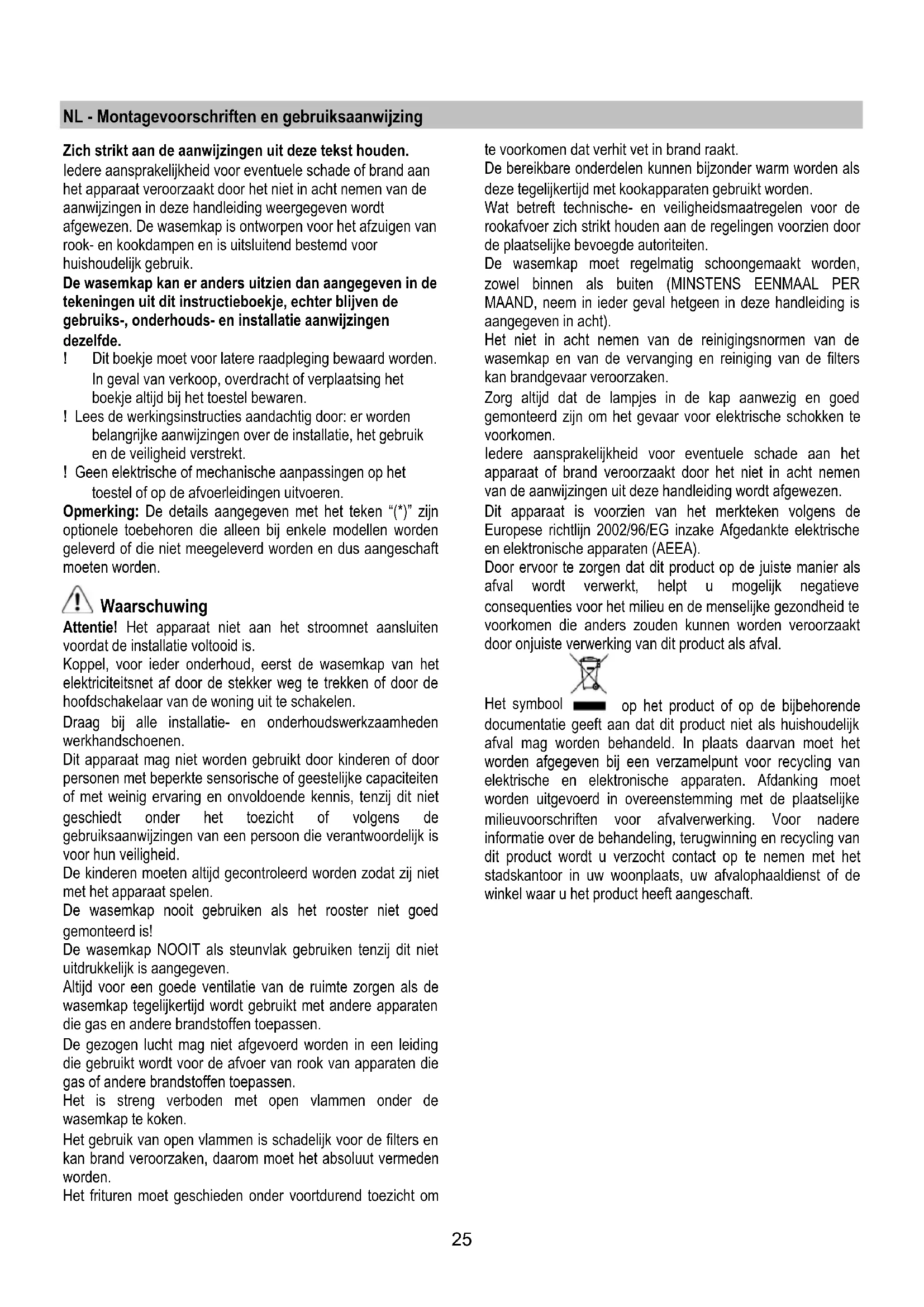 Dans l’éventualité où l’éclairage ne devait pas fonctionner, vérifier si les lampes ont été introduites correctement dans leur logement, avant de contacter le service après-vente.25 NL - Montagevoorschriften en gebruiksaanwijzing Zich strikt aan de aanwijzingen uit deze tekst houden. Iedere aansprakelijkheid voor eventuele schade of brand aan het apparaat veroorzaakt door het niet in acht nemen van de aanwijzingen in deze handleiding weergegeven wordt afgewezen. De wasemkap is ontworpen voor het afzuigen van rook- en kookdampen en is uitsluitend bestemd voor huishoudelijk gebruik. De wasemkap kan er anders uitzien dan aangegeven in de tekeningen uit dit instructieboekje, echter blijven de gebruiks-, onderhouds- en installatie aanwijzingen dezelfde. ! Dit boekje moet voor latere raadpleging bewaard worden. In geval van verkoop, overdracht of verplaatsing het boekje altijd bij het toestel bewaren. ! Lees de werkingsinstructies aandachtig door: er worden belangrijke aanwijzingen over de installatie, het gebruik en de veiligheid verstrekt. ! Geen elektrische of mechanische aanpassingen op het toestel of op de afvoerleidingen uitvoeren. Opmerking: De details aangegeven met het teken “(*)” zijn optionele toebehoren die alleen bij enkele modellen worden geleverd of die niet meegeleverd worden en dus aangeschaft moeten worden. Waarschuwing Attentie! Het apparaat niet aan het stroomnet aansluiten voordat de installatie voltooid is. Koppel, voor ieder onderhoud, eerst de wasemkap van het elektriciteitsnet af door de stekker weg te trekken of door de hoofdschakelaar van de woning uit te schakelen. Draag bij alle installatie- en onderhoudswerkzaamheden werkhandschoenen. Dit apparaat mag niet worden gebruikt door kinderen of door personen met beperkte sensorische of geestelijke capaciteiten of met weinig ervaring en onvoldoende kennis, tenzij dit niet geschiedt onder het toezicht of volgens de gebruiksaanwijzingen van een persoon die verantwoordelijk is voor hun veiligheid. De kinderen moeten altijd gecontroleerd worden zodat zij niet met het apparaat spelen. De wasemkap nooit gebruiken als het rooster niet goed gemonteerd is! De wasemkap NOOIT als steunvlak gebruiken tenzij dit niet uitdrukkelijk is aangegeven. Altijd voor een goede ventilatie van de ruimte zorgen als de wasemkap tegelijkertijd wordt gebruikt met andere apparaten die gas en andere brandstoffen toepassen. De gezogen lucht mag niet afgevoerd worden in een leiding die gebruikt wordt voor de afvoer van rook van apparaten die gas of andere brandstoffen toepassen. Het is streng verboden met open vlammen onder de wasemkap te koken. Het gebruik van open vlammen is schadelijk voor de filters en kan brand veroorzaken, daarom moet het absoluut vermeden worden. Het frituren moet geschieden onder voortdurend toezicht om te voorkomen dat verhit vet in brand raakt. De bereikbare onderdelen kunnen bijzonder warm worden als deze tegelijkertijd met kookapparaten gebruikt worden. Wat betreft technische- en veiligheidsmaatregelen voor de rookafvoer zich strikt houden aan de regelingen voorzien door de plaatselijke bevoegde autoriteiten. De wasemkap moet regelmatig schoongemaakt worden, zowel binnen als buiten (MINSTENS EENMAAL PER MAAND, neem in ieder geval hetgeen in deze handleiding is aangegeven in acht). Het niet in acht nemen van de reinigingsnormen van de wasemkap en van de vervanging en reiniging van de filters kan brandgevaar veroorzaken. Zorg altijd dat de lampjes in de kap aanwezig en goed gemonteerd zijn om het gevaar voor elektrische schokken te voorkomen. Iedere aansprakelijkheid voor eventuele schade aan het apparaat of brand veroorzaakt door het niet in acht nemen van de aanwijzingen uit deze handleiding wordt afgewezen. Dit apparaat is voorzien van het merkteken volgens de Europese richtlijn 2002/96/EG inzake Afgedankte elektrische en elektronische apparaten (AEEA). Door ervoor te zorgen dat dit product op de juiste manier als afval wordt verwerkt, helpt u mogelijk negatieve consequenties voor het milieu en de menselijke gezondheid te voorkomen die anders zouden kunnen worden veroorzaakt door onjuiste verwerking van dit product als afval. Het symbool op het product of op de bijbehorende documentatie geeft aan dat dit product niet als huishoudelijk afval mag worden behandeld. In plaats daarvan moet het worden afgegeven bij een verzamelpunt voor recycling van elektrische en elektronische apparaten. Afdanking moet worden uitgevoerd in overeenstemming met de plaatselijke milieuvoorschriften voor afvalverwerking. Voor nadere informatie over de behandeling, terugwinning en recycling van dit product wordt u verzocht contact op te nemen met het stadskantoor in uw woonplaats, uw afvalophaaldienst of de winkel waar u het product heeft aangeschaft.26 Het gebruik De kap is vervaardigd voor gebruik in de afzuigversie met afvoer naar buiten, of de filtrerende versie, met luchtcirculatie. Uitvoering als afzuigend apparaat De aangezogen rook en damp worden naar buiten geleid via een afvoerpijp die is aangesloten op de verbindingsring aan de bovenkant van de wasemkap. Attentie: De afvoerpijp wordt hierbij niet geleverd en moet apart aangekocht worden. De middellijn van de afvoerpijp moet even groot zijn als die van de verbindingsring. De horizontale stukken van de buis moeten enigszins omhoog hellen (ongeveer 10°) om de lucht gemakkelijk naar buiten te voeren. Note. Als de wasemkap reeds is voorzien van koolstoffilter dan moet u dit verwijderen. Verbind de wasemkap aan wandafvoerpijpen en afvoeropeningen met dezelfde diameter als de luchtuitgang (verbindingsflens).Het gebruik van wandafvoerpijpen of afvoeropeningen met een kleinere diameter zal leiden tot een vermogensverlies en een sterke toename van het bedrijfsgeluid. Iedere aansprakelijkheid hiervoor wordt afgewezen. ! De lengte van het afvoerkanaal moet zo kort mogelijk zijn. ! Gebruik zo min mogelijk bochten (maximaal toegestane hoek: 90°). ! Vermijd grote verschillen in doorsned