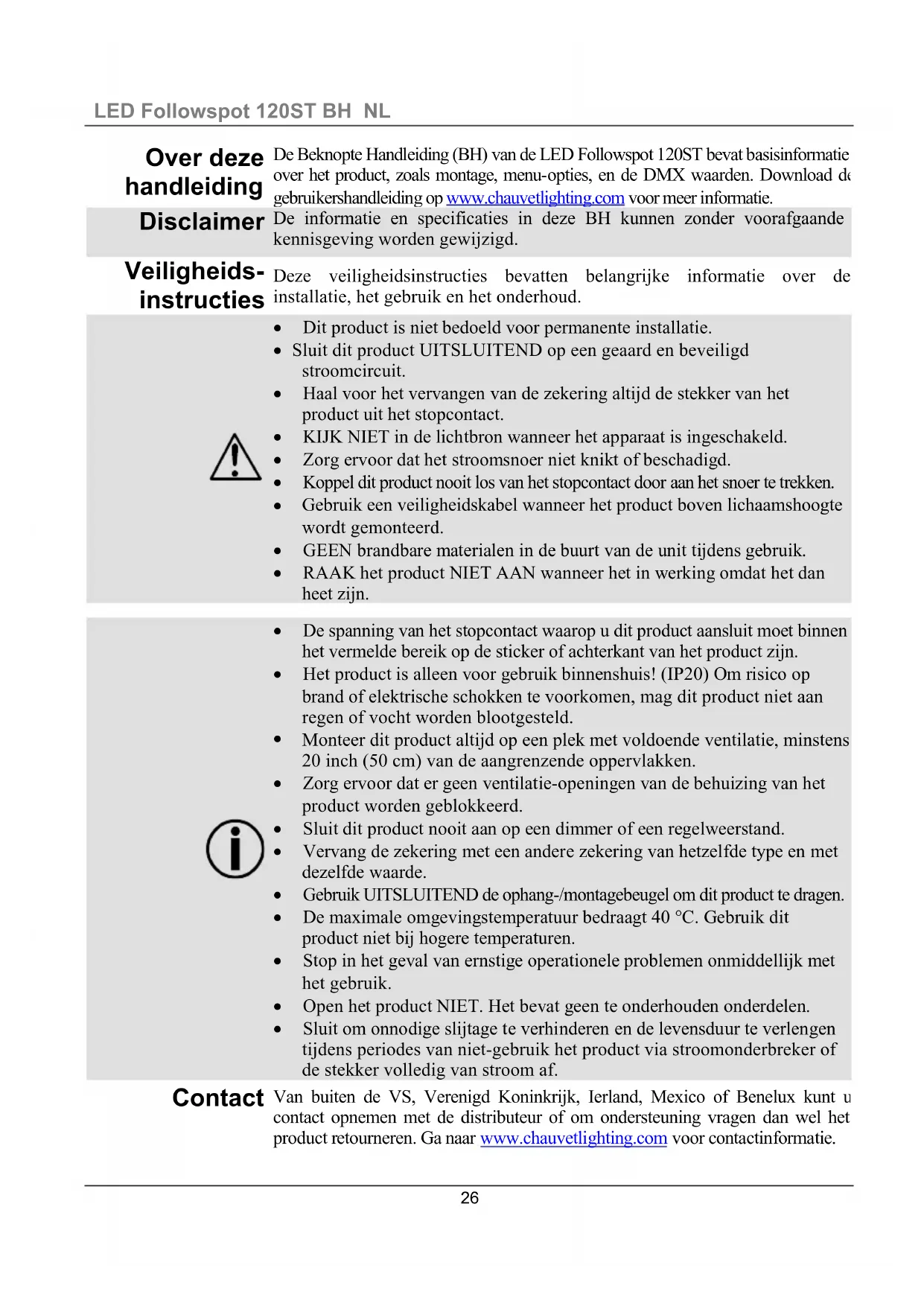 De Beknopte Handleiding (BH) van de LED Followspot 120ST bevat basisinformatie over het product, zoals montage, menu- opties, en de DMX waarden. Download de gebruikershandleiding op www.chauvetlighting.com voor meer informatie. Disclaimer De informatie en specificaties in deze BH kunnen zonder voorafgaande kennisgeving worden gewijzigd. Veiligheids- instructies