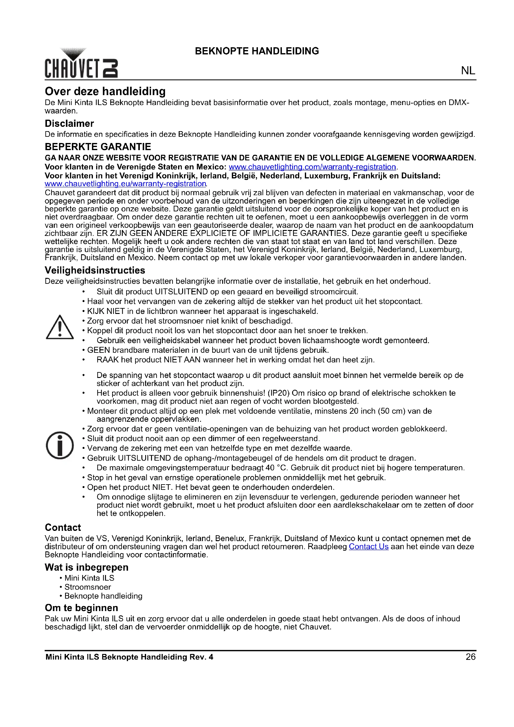 Chauvet garandeert dat dit product bij normaal gebruik vrij zal blijven van defecten in materiaal en vakmanschap, voor de opgegeven periode en onder voorbehoud van de uitzonderingen en beperkingen die zijn uiteengezet in de volledige beperkte garantie op onze website. Deze garantie geldt uitsluitend voor de oorspronkelijke koper van het product en is niet overdraagbaar. Om onder deze garantie rechten uit te oefenen, moet u een aankoopbewijs overleggen in de vorm van een origineel verkoopbewijs van een geautoriseerde dealer, waarop de naam van het product en de aankoopdatum zichtbaar zijn. ER ZIJN GEEN ANDERE EXPLICIETE OF IMPLICIETE GARANTIES. Deze garantie geeft u specifieke wettelijke rechten. Mogelijk heeft u ook andere rechten die van staat tot staat en van land tot land verschillen. Deze garantie is uitsluitend geldig in de Verenigde Staten, het Verenigd Koninkrijk, Ierland, België, Nederland, Luxemburg, Frankrijk, Duitsland en Mexico. Neem contact op met uw lokale verkoper voor garantievoorwaarden in andere landen. Veiligheidsinstructies Deze veiligheidsinstructies bevatten belangrijke informatie over de installatie, het gebruik en het onderhoud. Contact Van buiten de VS, Verenigd Koninkrijk, Ierland, Benelux, Frankrijk, Duitsland of Mexico kunt u contact opnemen met de distributeur of om ondersteuning vragen dan wel het product retourneren. Raadpleeg Contact Us aan het einde van deze Beknopte Handleiding voor contactinformatie. Wat is inbegrepen Om te beginnen Pak uw Mini Kinta ILS uit en zorg ervoor dat u alle onderdelen in goede staat hebt ontvangen. Als de doos of inhoud beschadigd lijkt, stel dan de vervoerder onmiddellijk op de hoogte, niet Chauvet.
