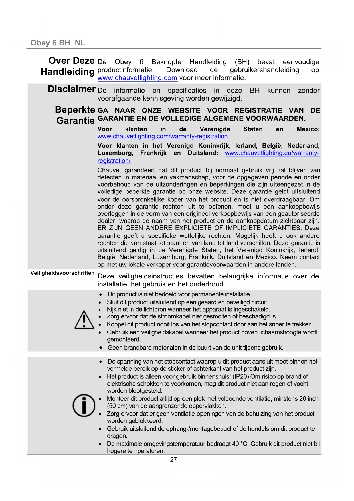 GA NAAR ONZE WEBSITE VOOR REGISTRATIE VAN DE GARANTIE EN DE VOLLEDIGE ALGEMENE VOORWAARDEN. Voor klanten in de Verenigde Staten en Mexico: www.chauvetlighting.com/warranty-registration Voor klanten in het Verenigd Koninkrijk, Ierland, België, Nederland, Luxemburg, Frankrijk en Duitsland: www.chauvetlighting.eu/warranty- registration/ Chauvet garandeert dat dit product bij normaal gebruik vrij zal blijven van defecten in materiaal en vakmanschap, voor de opgegeven periode en onder voorbehoud van de uitzonderingen en beperkingen die zijn uiteengezet in de volledige beperkte garantie op onze website. Deze garantie geldt ui tsluitend voor de oorspronkelijke koper van het product en is niet overdraagbaar. Om onder deze garantie rechten uit te oefenen, moet u een aankoopbewijs overleggen in de vorm van een origineel verkoopbewijs van een geautoriseerde dealer, waarop de naam va n het product en de aankoopdatum zichtbaar zijn. ER ZIJN GEEN ANDERE EXPLICIETE OF IMPLICIETE GARANTIES. Deze garantie geeft u specifieke wettelijke rechten. Mogelijk heeft u ook andere rechten die van staat tot staat en van land tot land verschillen. Deze garantie is uitsluitend geldig in de Verenigde Staten, het Verenigd Koninkrijk, Ierland, België, Nederland, Luxemburg, Frankrijk, Duitsland en Mexico. Neem contact op met uw lokale verkoper voor garantievoorwaarden in andere landen. Veiligheidsvoorschriften Deze veiligheidsinstructies bevatten belangrijke informatie over de installatie, het gebruik en het onderhoud.