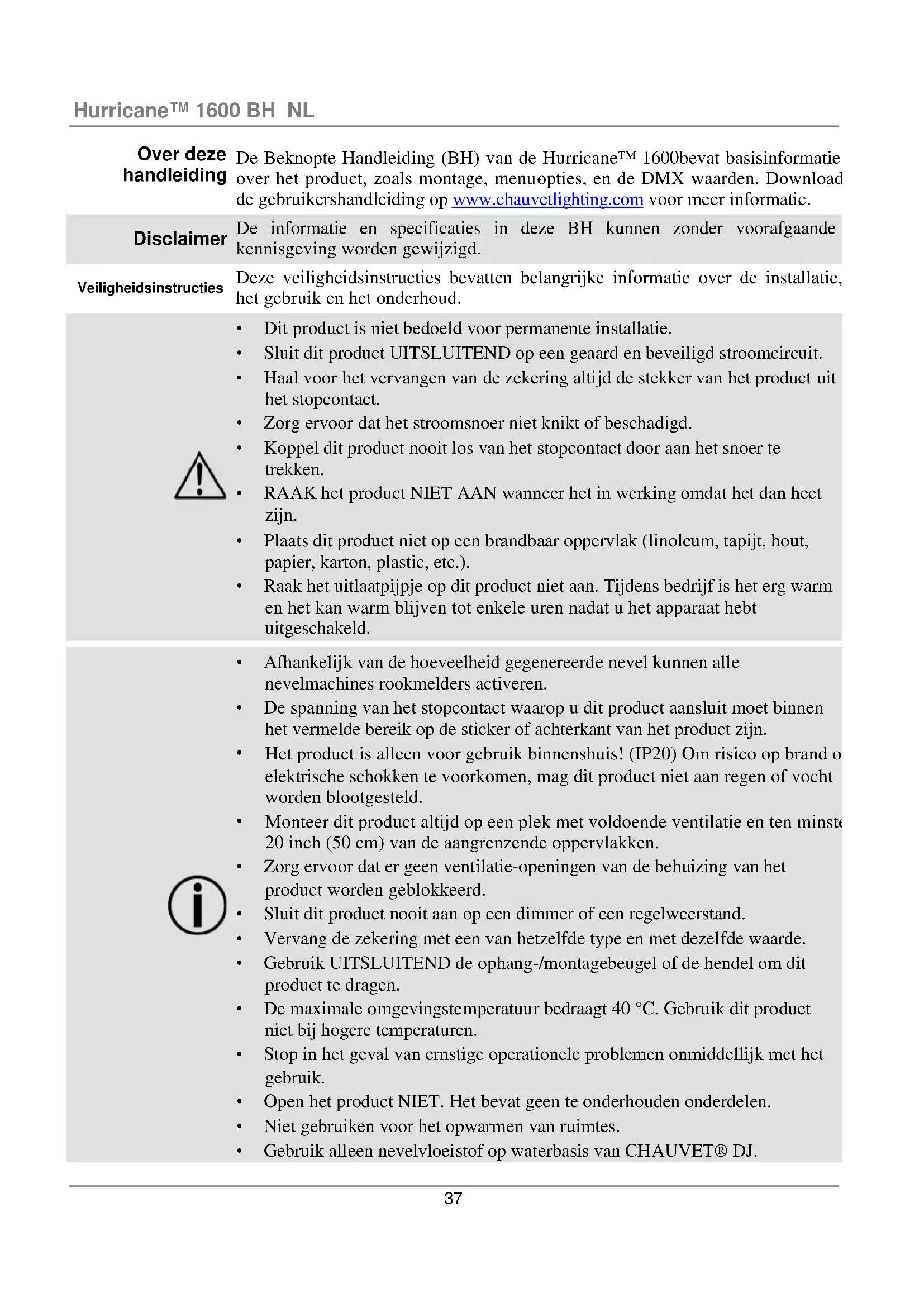 De Beknopte Handleiding (BH) van de Hurricane™ 1600 bevat basisinformatie over het product, zoals montage, menu- opties, en de DMX waarden. Download de gebruikershandleiding op www.chauvetlighting.com voor meer informatie. Disclaimer