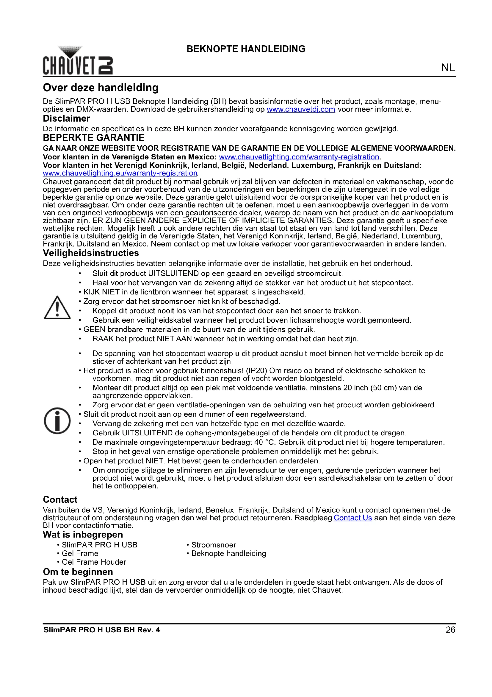 SlimPAR PRO H USB BH Rev. 4 BEKNOPTE HANDLEIDING Over deze handleiding De SlimPAR PRO H USB Beknopte Handleiding (BH) bevat basisinformatie over het product, zoals montage, menu- opties en DMX-waarden. Download de gebruikershandleiding op www.chauvetdj.com voor meer informatie. Disclaimer De informatie en specificaties in deze BH kunnen zonder voorafgaande kennisgeving worden gewijzigd. BEPERKTE GARANTIE GA NAAR ONZE WEBSITE VOOR REGISTRATIE VAN DE GARANTIE EN DE VOLLEDIGE ALGEMENE VOORWAARDEN. Voor klanten in de Verenigde Staten en Mexico: www.chauvetlighting.com/warranty-registration. Voor klanten in het Verenigd Koninkrijk, Ierland, België, Nederland, Luxemburg, Frankrijk en Duitsland: www.chauvetlighting.eu/warranty-registration