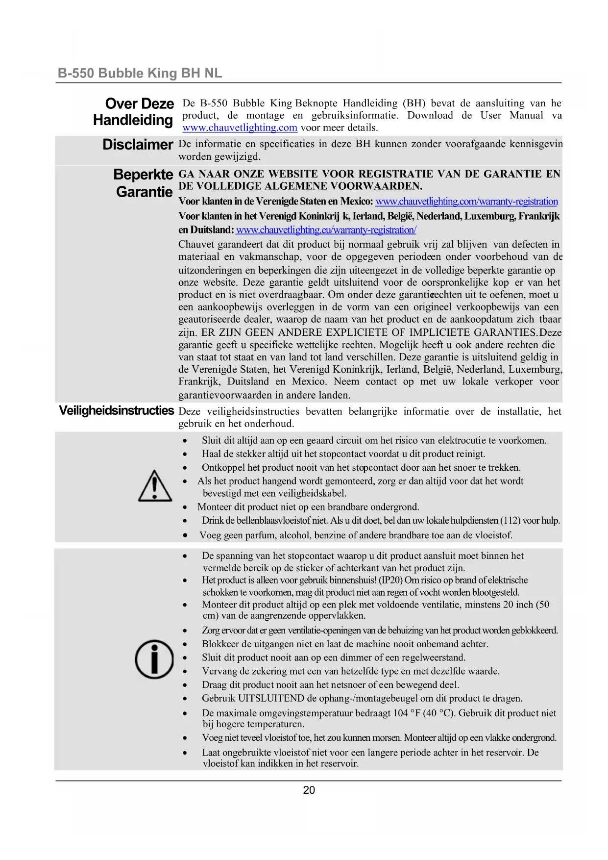 De B-550 Bubble King Beknopte Handleiding (BH) bevat de aansluiting van het product, de montage en gebruiksinformatie. Download de User Manual van www.chauvetlighting.com voor meer details. Disclaimer De informatie en specificaties in deze BH kunnen zonder voorafgaande kennisgeving worden gewijzigd. Beperkte Garantie
