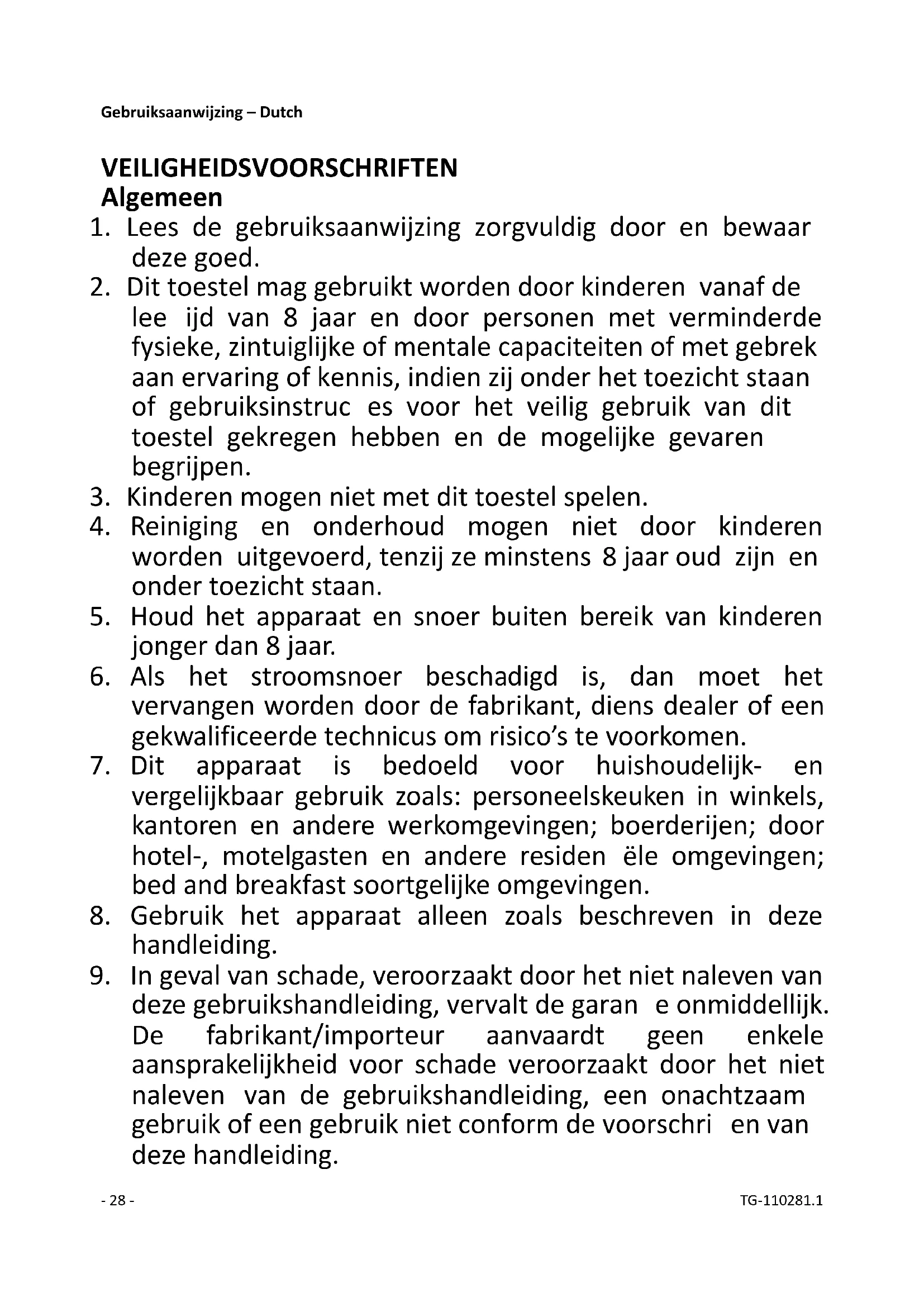 deze gebruikshandleiding, vervalt de garantie onmiddellijk. De fabrikant/importeur aanvaardt geen enkele aansprakelijkheid voor schade veroorzaakt door het niet naleven van de gebruikshandleiding, een onachtzaam gebruik of een gebruik niet conform de voorschriften van deze handleiding.- 29 - TG-110281.1