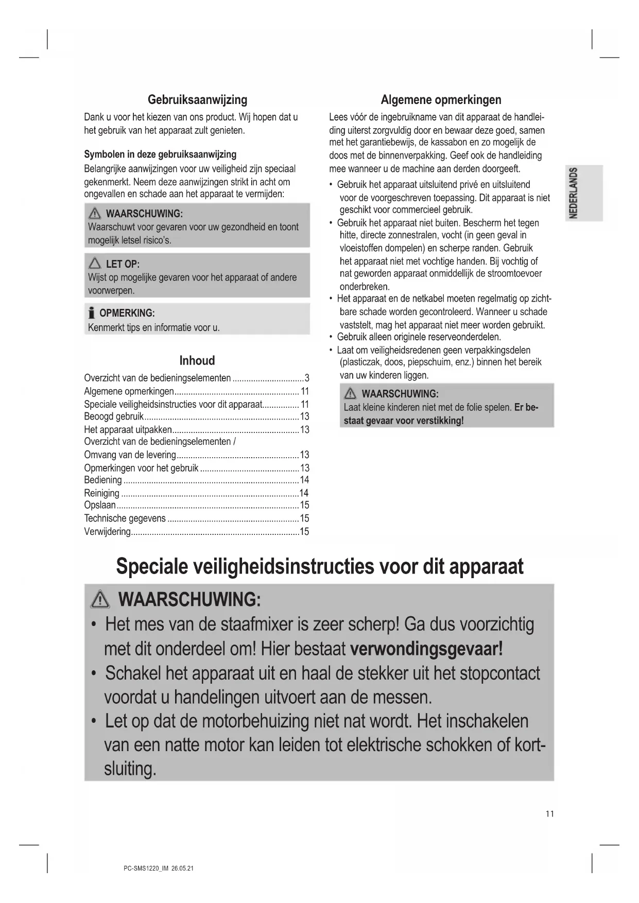 - Het mes van de staafmixer is zeer scherp. Wees uiterst voor- zichtig.PC-SMS1220_IM 26.05.21