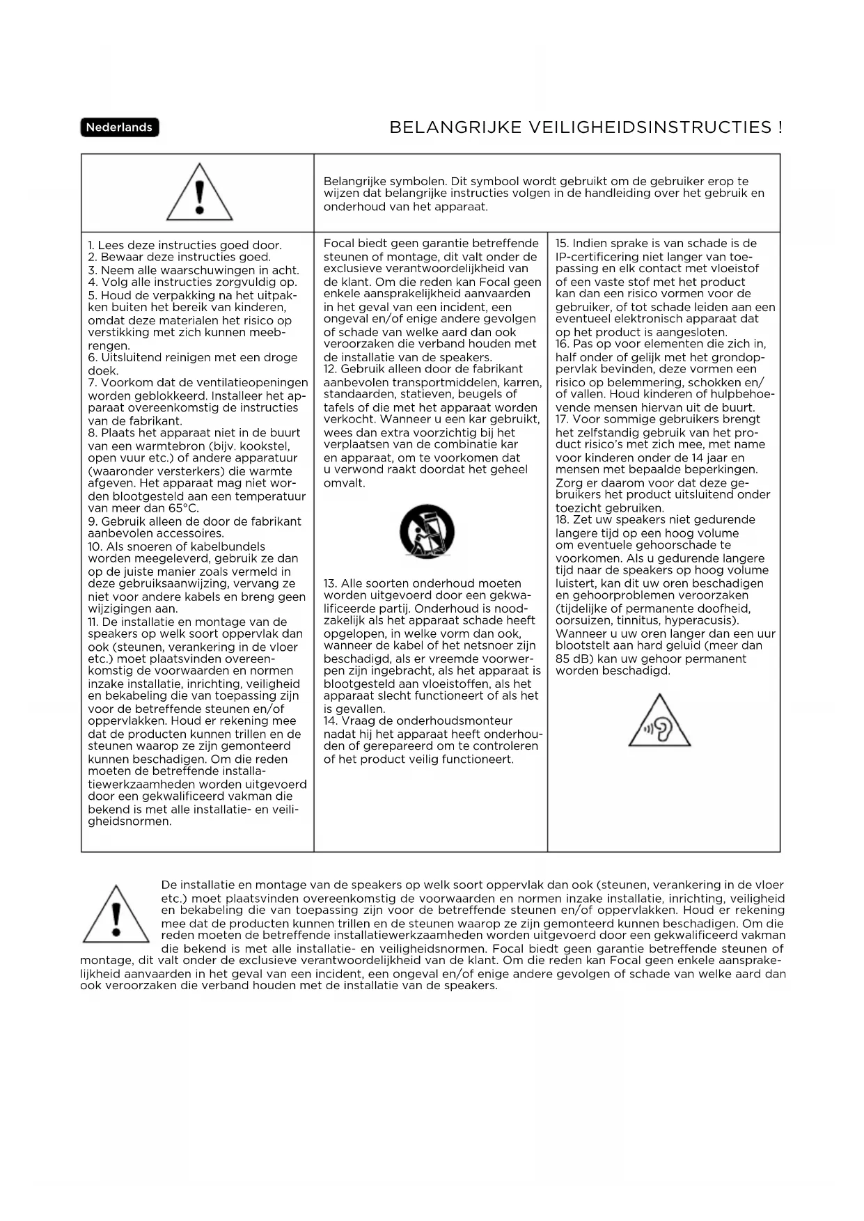 langere tijd op een hoog volume om eventuele gehoorschade te voorkomen. Als u gedurende langere tijd naar de speakers op hoog volume luistert, kan dit uw oren beschadigen en gehoorproblemen veroorzaken (tijdelijke of permanente doofheid, oorsuizen, tinnitus, hyperacusis). Wanneer u uw oren langer dan een uur blootstelt aan hard geluid (meer dan 85 dB) kan uw gehoor permanent worden beschadigd. De installatie en montage van de speakers op welk soort oppervlak dan ook (steunen, verankering in de vloer etc.) moet plaatsvinden overeenkomstig de voorwaarden en normen inzake installatie, inrichting, veiligheid en bekabeling die van toepassing zijn voor de betreende steunen en/of oppervlakken. Houd er rekening mee dat de producten kunnen trillen en de steunen waarop ze zijn gemonteerd kunnen beschadigen. Om die reden moeten de betreende installatiewerkzaamheden worden uitgevoerd door een gekwalificeerd vakman die bekend is met alle installatie- en veiligheidsnormen. Focal biedt geen garantie betreende steunen of montage, dit valt onder de exclusieve verantwoordelijkheid van de klant. Om die reden kan Focal geen enkele aansprake- lijkheid aanvaarden in het geval van een incident, een ongeval en/of enige andere gevolgen of schade van welke aard dan ook veroorzaken die verband houden met de installatie van de speakers.NL