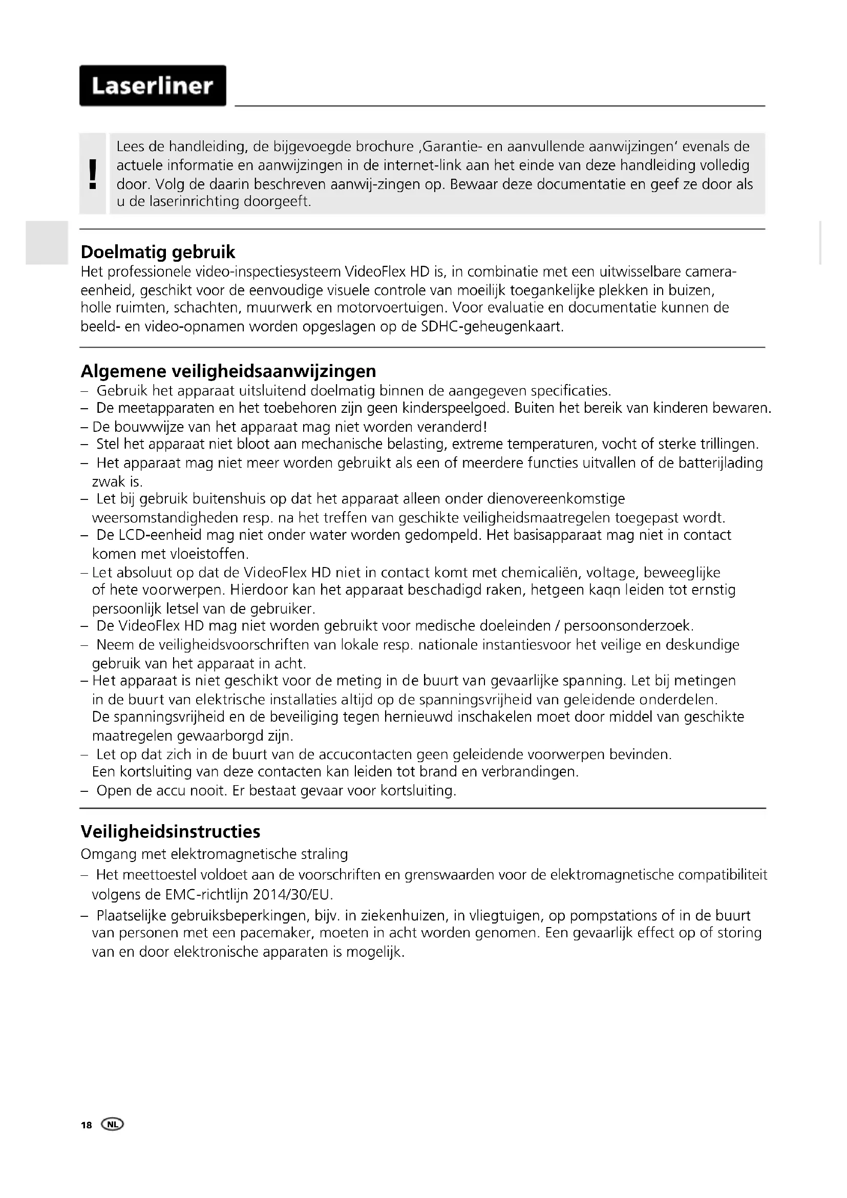 Veiligheidsinstructies Omgang met elektromagnetische straling – Het meettoestel voldoet aan de voorschriften en grenswaarden voor de elektromagnetische compatibiliteit volgens de EMC-richtlijn 2014/30/EU. – Plaatselijke gebruiksbeperkingen, bijv. in ziekenhuizen, in vliegtuigen, op pompstations of in de buurt van personen met een pacemaker, moeten in acht worden genomen. Een gevaarlijk effect op of storing van en door elektronische apparaten is mogelijk. Algemene veiligheidsaanwijzingen – Gebruik het apparaat uitsluitend doelmatig binnen de aangegeven specicaties. – De meetapparaten en het toebehoren zijn geen kinderspeelgoed. Buiten het bereik van kinderen bewaren. – De bouwwijze van het apparaat mag niet worden veranderd! – Stel het apparaat niet bloot aan mechanische belasting, extreme temperaturen, vocht of sterke trillingen. – Het apparaat mag niet meer worden gebruikt als een of meerdere functies uitvallen of de batterijlading zwak is. – Let b gebruik buitenshuis op dat het apparaat alleen onder dienovereenkomstige weersomstandigheden resp. na het treffen van geschikte veiligheidsmaatregelen toegepast wordt. – De LCD-eenheid mag niet onder water worden gedompeld. Het basisapparaat mag niet in contact komen met vloeistoffen. – Let absoluut op dat de VideoFlex HD niet in contact komt met chemicaliën, voltage, beweeglijke of hete voorwerpen. Hierdoor kan het apparaat beschadigd raken, hetgeen kaqn leiden tot ernstig persoonlijk letsel van de gebruiker. – De VideoFlex HD mag niet worden gebruikt voor medische doeleinden / persoonsonderzoek. – Neem de veiligheidsvoorschriften van lokale resp. nationale instantiesvoor het veilige en deskundige gebruik van het apparaat in acht. – Het apparaat is niet geschikt voor de meting in de buurt van gevaarlijke spanning. Let bij metingen in de buurt van elektrische installaties altijd op de spanningsvrijheid van geleidende onderdelen. De spanningsvrijheid en de beveiliging tegen hernieuwd inschakelen moet door middel van geschikte maatregelen gewaarborgd zijn. – Let op dat zich in de buurt van de accucontacten geen geleidende voorwerpen bevinden. Een kortsluiting van deze contacten kan leiden tot brand en verbrandingen. – Open de accu nooit. Er bestaat gevaar voor kortsluiting. Doelmatig gebruik Het professionele video-inspectiesysteem VideoFlex HD is, in combinatie met een uitwisselbare camera- eenheid, geschikt voor de eenvoudige visuele controle van moeilk toegankelke plekken in buizen, holle ruimten, schachten, muurwerk en motorvoertuigen. Voor evaluatie en documentatie kunnen de beeld- en video-opnamen worden opgeslagen op de SDHC-geheugenkaart.