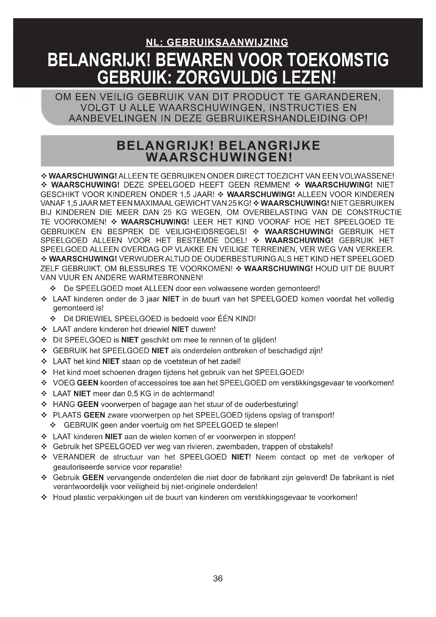 GEBRUIK: ZORGVULDIG LEZEN! BELANGRIJK! BELANGRIJKE WAARSCHUWINGEN! WAARSCHUWING! ALLEEN TE GEBRUIKEN ONDER DIRECT TOEZICHT VAN EEN VOLWASSENE! WAARSCHUWING! DEZE SPEELGOED HEEFT GEEN REMMEN! WAARSCHUWING! NIET GESCHIKT VOOR KINDEREN ONDER 1,5 JAAR! WAARSCHUWING! ALLEEN VOOR KINDEREN VANAF 1,5 JAAR MET EEN MAXIMAAL GEWICHT VAN 25 KG! WAARSCHUWING! NIET GEBRUIKEN BIJ KINDEREN DIE MEER DAN 25 KG WEGEN, OM OVERBELASTING VAN DE CONSTRUCTIE TE VOORKOMEN! WAARSCHUWING! LEER HET KIND VOORAF HOE HET SPEELGOED TE GEBRUIKEN EN BESPREK DE VEILIGHEIDSREGELS! WAARSCHUWING! GEBRUIK HET SPEELGOED ALLEEN VOOR HET BESTEMDE DOEL! WAARSCHUWING! GEBRUIK HET SPEELGOED ALLEEN OVERDAG OP VLAKKE EN VEILIGE TERREINEN, VER WEG VAN VERKEER. WAARSCHUWING! VERWIJDER ALTIJD DE OUDERBESTURING ALS HET KIND HET SPEELGOED ZELF GEBRUIKT, OM BLESSURES TE VOORKOMEN! WAARSCHUWING! HOUD UIT DE BUURT VAN VUUR EN ANDERE WARMTEBRONNEN! De SPEELGOED moet ALLEEN door een volwassene worden gemonteerd! LAAT kinderen onder de 3 jaar NIET in de buurt van het SPEELGOED komen voordat het volledig gemonteerd is! Dit DRIEWIEL SPEELGOED is bedoeld voor ÉÉN KIND! LAAT andere kinderen het driewiel NIET duwen! Dit SPEELGOED is NIET geschikt om mee te rennen of te glijden! GEBRUIK het SPEELGOED NIET als onderdelen ontbreken of beschadigd zijn! LAAT het kind NIET staan op de voetsteun of het zadel! Het kind moet schoenen dragen tijdens het gebruik van het SPEELGOED! VOEG GEEN koorden of accessoires toe aan het SPEELGOED om verstikkingsgevaar te voorkomen! LAAT NIET meer dan 0,5 KG in de achtermand! HANG GEEN voorwerpen of bagage aan het stuur of de ouderbesturing! PLAATS GEEN zware voorwerpen op het SPEELGOED tijdens opslag of transport! GEBRUIK geen ander voertuig om het SPEELGOED te slepen! LAAT kinderen NIET aan de wielen komen of er voorwerpen in stoppen! Gebruik het SPEELGOED ver weg van rivieren, zwembaden, trappen of obstakels! VERANDER de structuur van het SPEELGOED NIET! Neem contact op met de verkoper of geautoriseerde service voor reparatie! Gebruik GEEN vervangende onderdelen die niet door de fabrikant zijn geleverd! De fabrikant is niet verantwoordelijk voor veiligheid bij niet-originele onderdelen! Houd plastic verpakkingen uit de buurt van kinderen om verstikkingsgevaar te voorkomen! 36PRODUCTKENMERKEN Dit is een functioneel SPEELGOED, ontworpen om de basisvaardigheden van uw kind te ontwikkelen op het gebied van hand- en voetcoördinatie bij het zelfstandig besturen van een driewieler of fiets. WAARSCHUWING! Verwijder de ouderlijke duwstang alleen wanneer u er volledig zeker van bent dat het kind de driewieler zelfstandig kan rijden en bedienen. Het SPEELGOED is geschikt voor kinderen ouder dan 1,5 jaar en met een gewicht tot 25 kg. Wanneer het kind het SPEELGOED gebruikt, wordt het aangedreven met de pedalen. Wanneer het SPEELGOED door een volwassene wordt geduwd, plaatst het kind de voeten op de voetsteunen. Inclusief, veiligheidsbeugel, afneembare voetsteunen, verstelbare zonnekap en opbergmand BELANGRIJKE ONDERDELEN