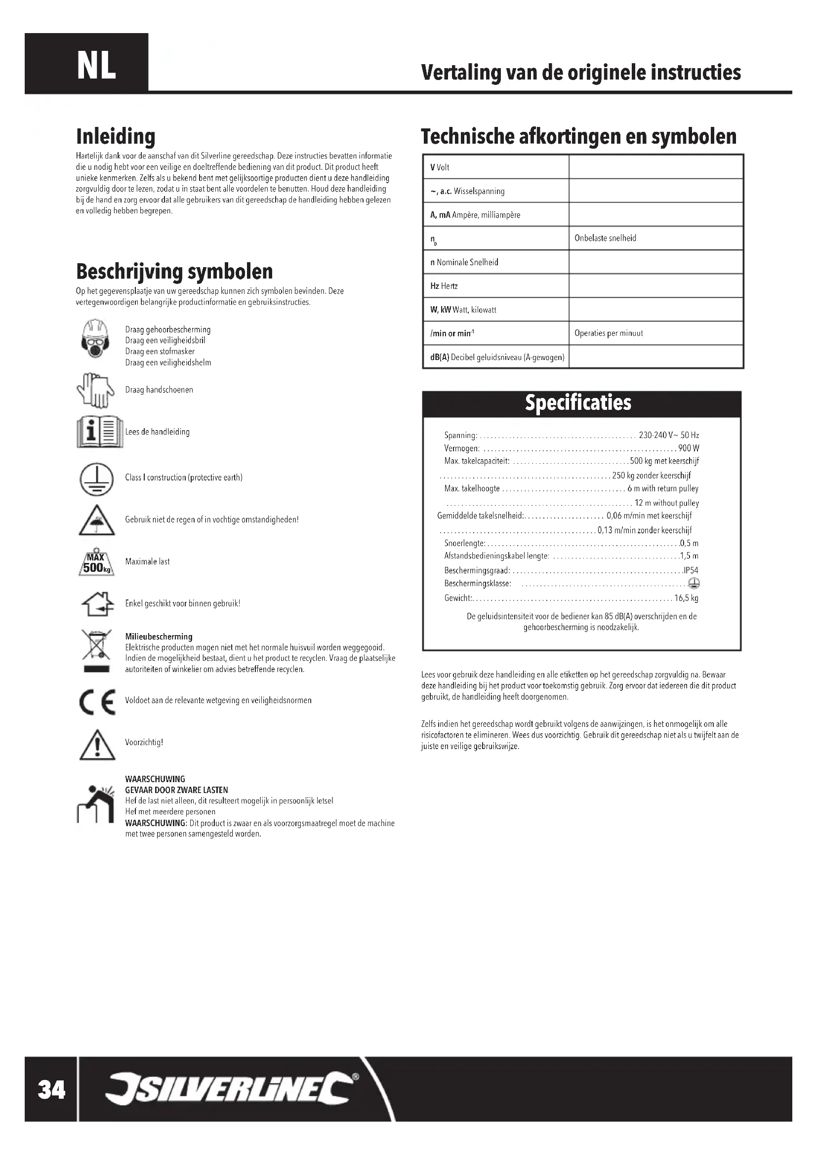 Spanning: ........................................... 230-240 V~ 50 Hz Vermogen: .....................................................900 W Max. takelcapaciteit: ................................500 kg met keerschijf ...............................................250 kg zonder keerschijf Max. takelhoogte ..................................6mwithreturnpulley ...................................................12mwithoutpulley Gemiddelde takelsnelheid:...................... 0,06 m/min met keerschijf ...........................................0,13 m/min zonder keerschijf Snoerlengte:.....................................................0,5 m Afstandsbedieningskabellengte: ...................................1,5 m Beschermingsgraad: ...............................................IP54 Beschermingsklasse: ............................................... Gewicht:.......................................................16,5 kg Degeluidsintensiteitvoordebedienerkan85dB(A)overschrijdenende gehoorbeschermingisnoodzakelijk. Inleiding HartelijkdankvoordeaanschafvanditSilverlinegereedschap.Dezeinstructiesbevatteninformatiedieunodighebtvooreenveiligeendoeltreffendebedieningvanditproduct.Ditproductheeftuniekekenmerken.Zelfsalsubekendbentmetgelijksoortigeproductendientudezehandleidingzorgvuldigdoortelezen,zodatuinstaatbentallevoordelentebenutten.Houddezehandleidingbijdehandenzorgervoordatallegebruikersvanditgereedschapdehandleidinghebbengelezenenvolledighebbenbegrepen. Specicaties MAX 500kg T-130˚ 442463/943263_Manual.indd 34 22/07/2019 15:31900 W elektrische takel